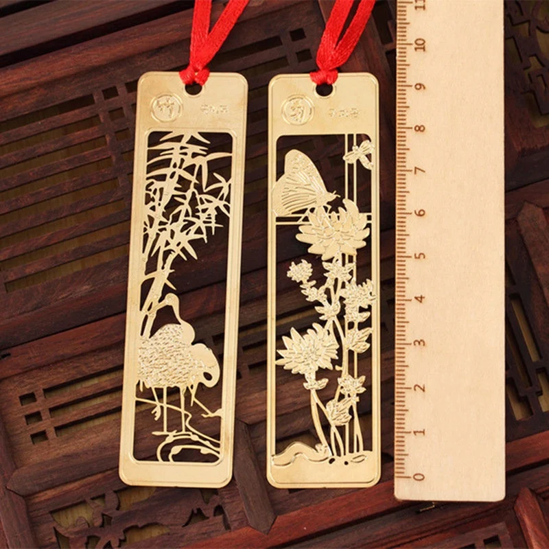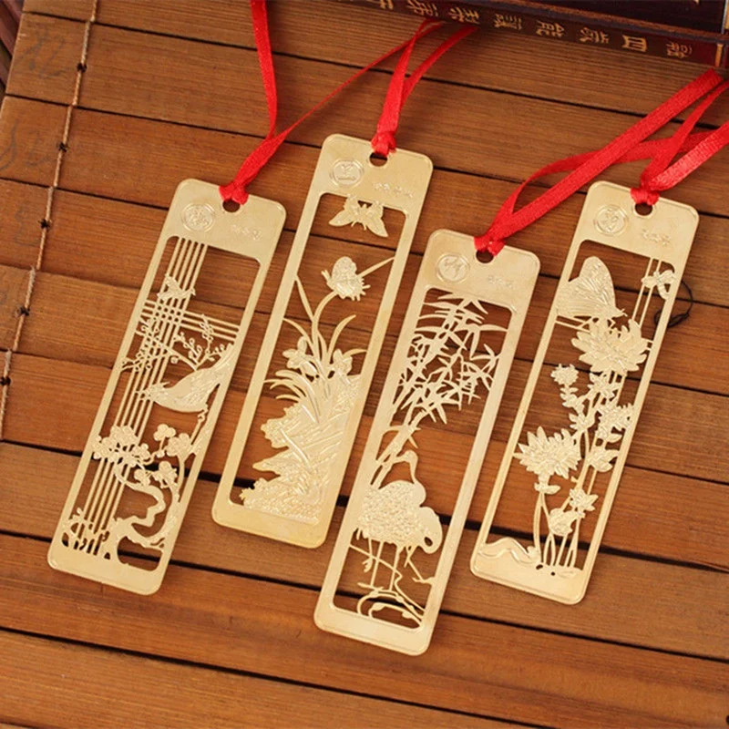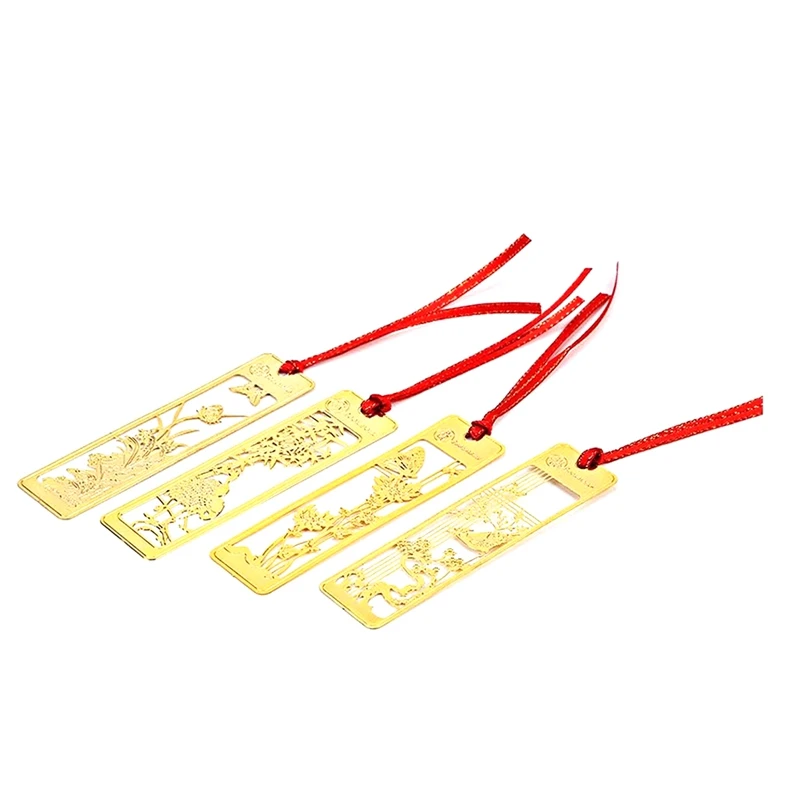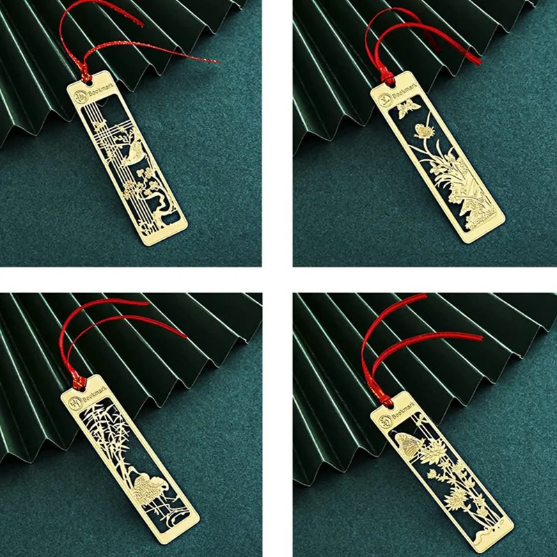 Comprar Marcapáginas dorado de estilo chino para niños y mujeres, 4 piezas, marca de libro hueca dorada con correa de anudado rojo