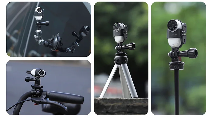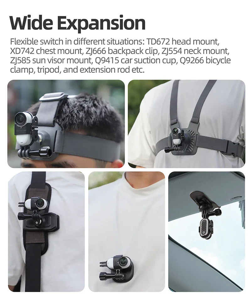 Prácticas correas adaptadoras, correas para el pecho, clips para mochila, soportes magnéticos para cuello halter, soportes para parasol, ventosas para automóviles, clips para bicicletas, trípodes, varillas de extensión, etc.