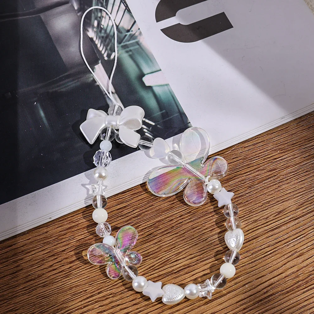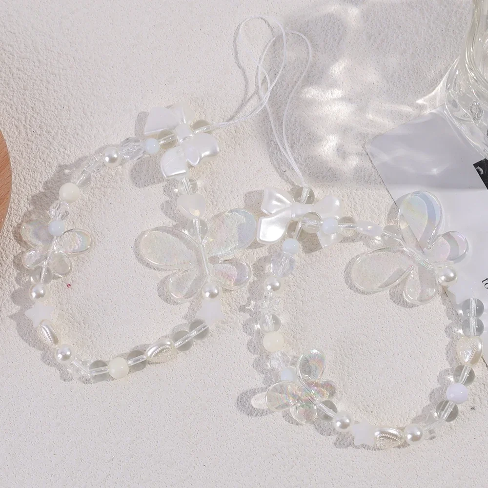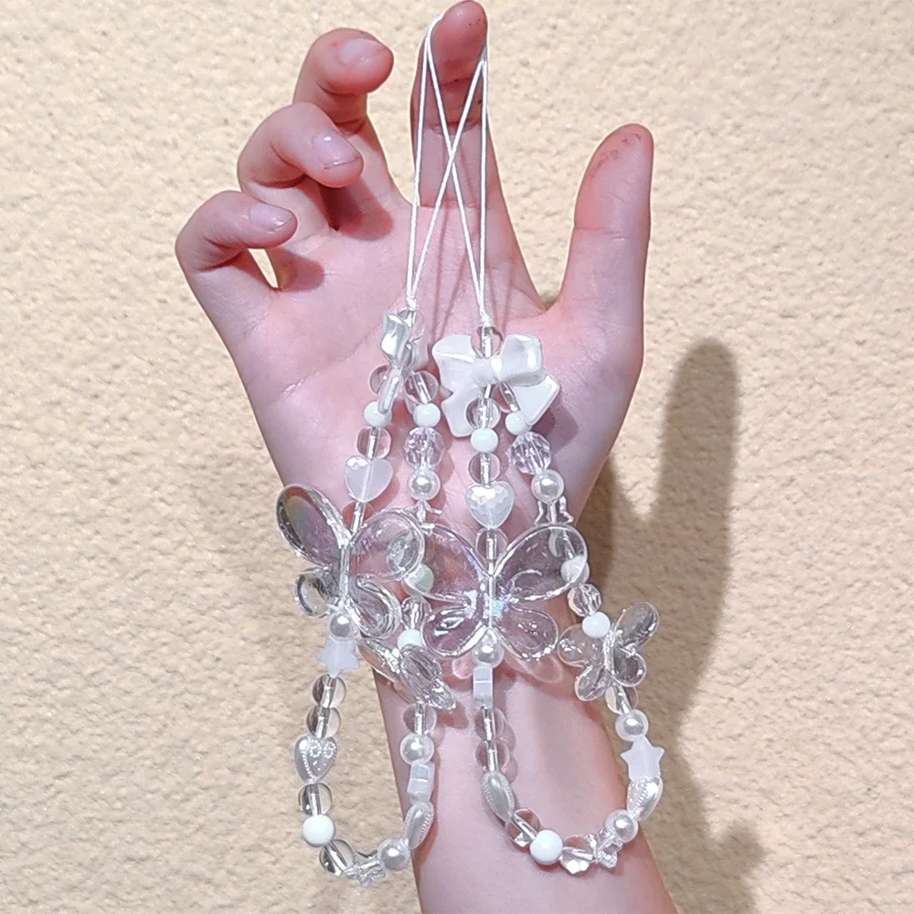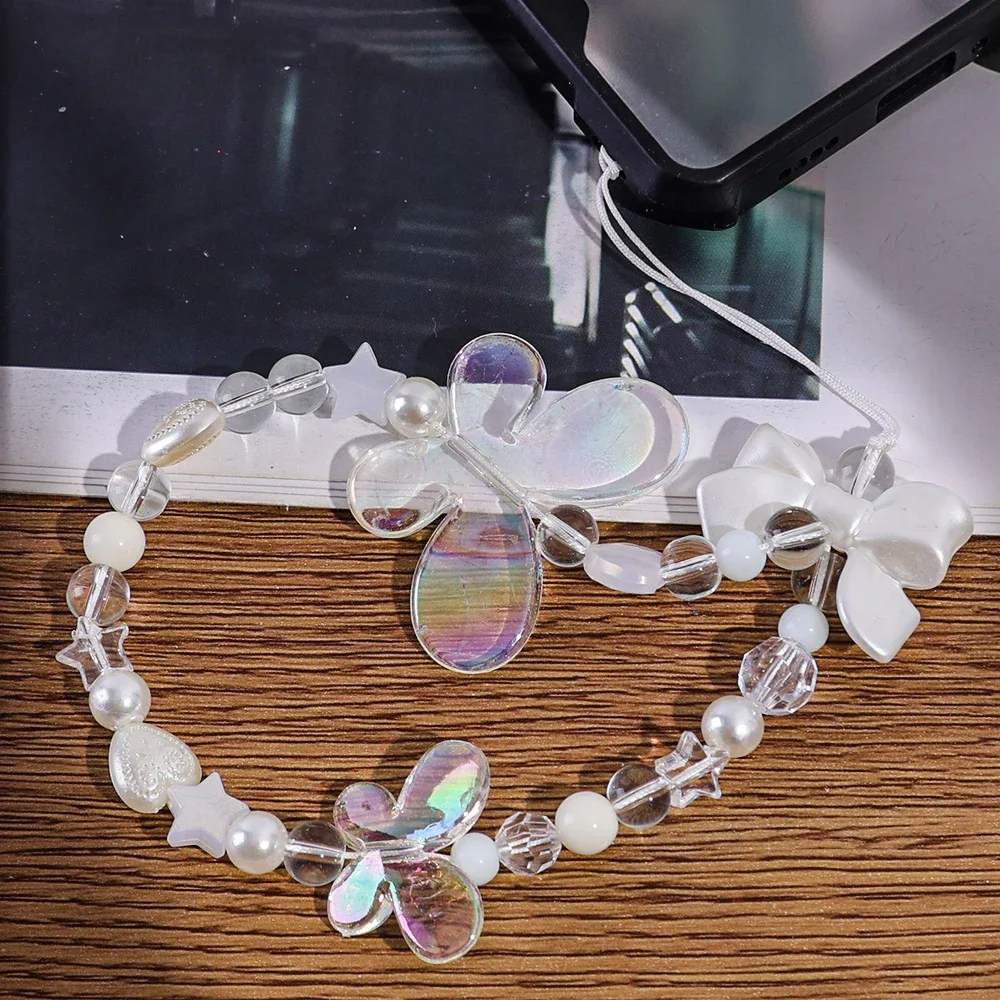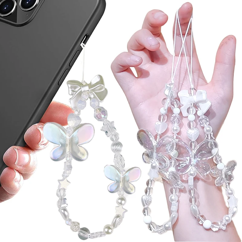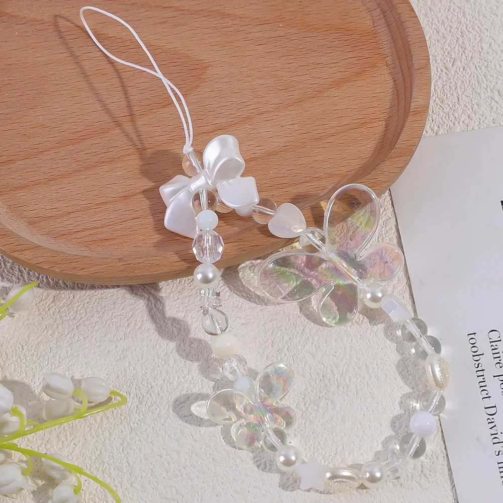 Comprar Mariposa perla con cuentas teléfono encanto correa mano muñeca Smartphone cordón para IPhone Samsung teléfono llavero pulsera Correa