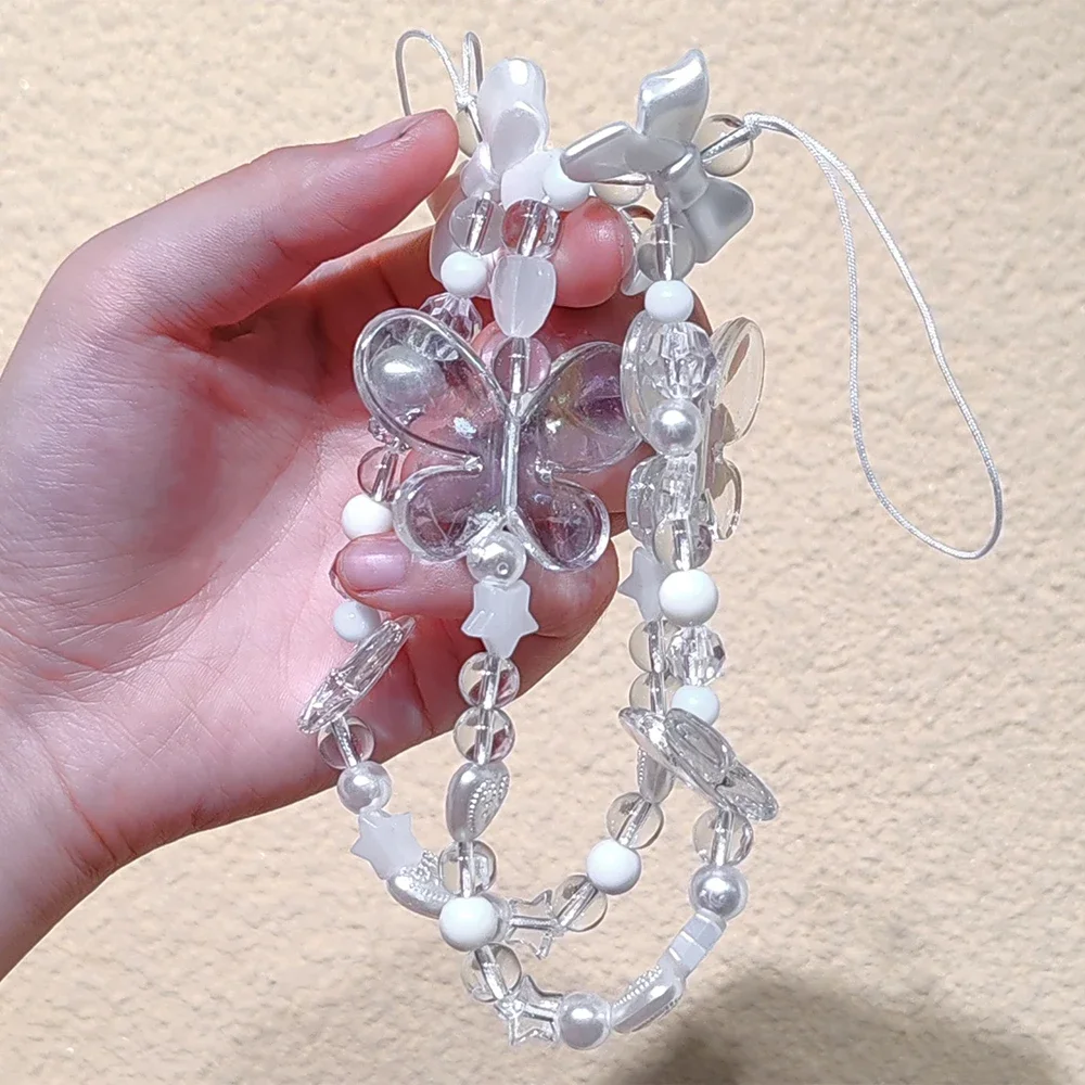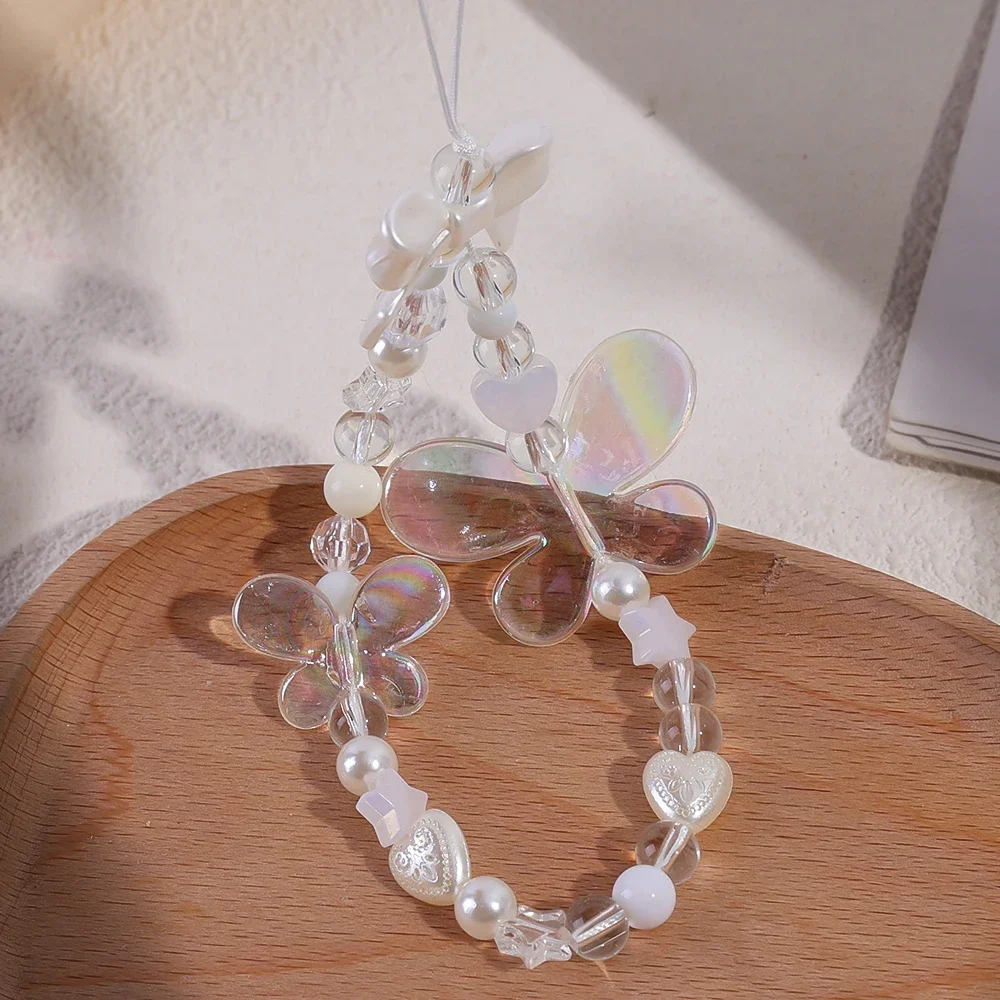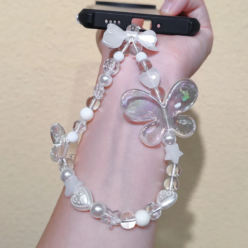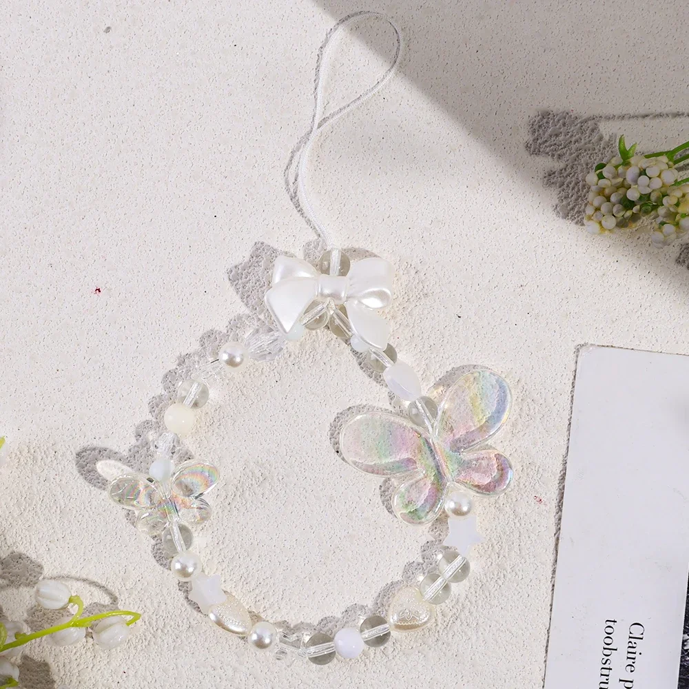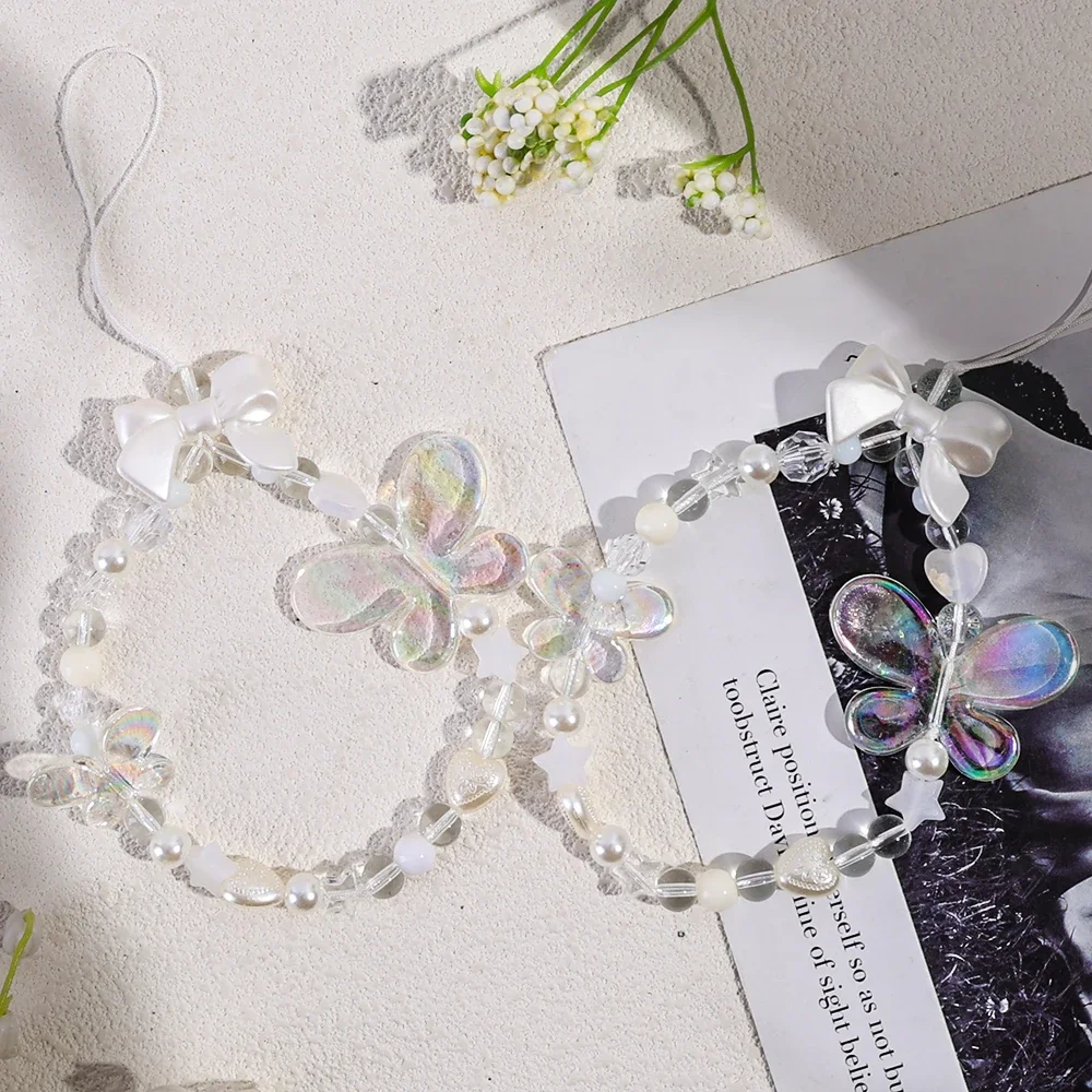 Comprar Mariposa perla con cuentas teléfono encanto correa mano muñeca Smartphone cordón para IPhone Samsung teléfono llavero pulsera Correa