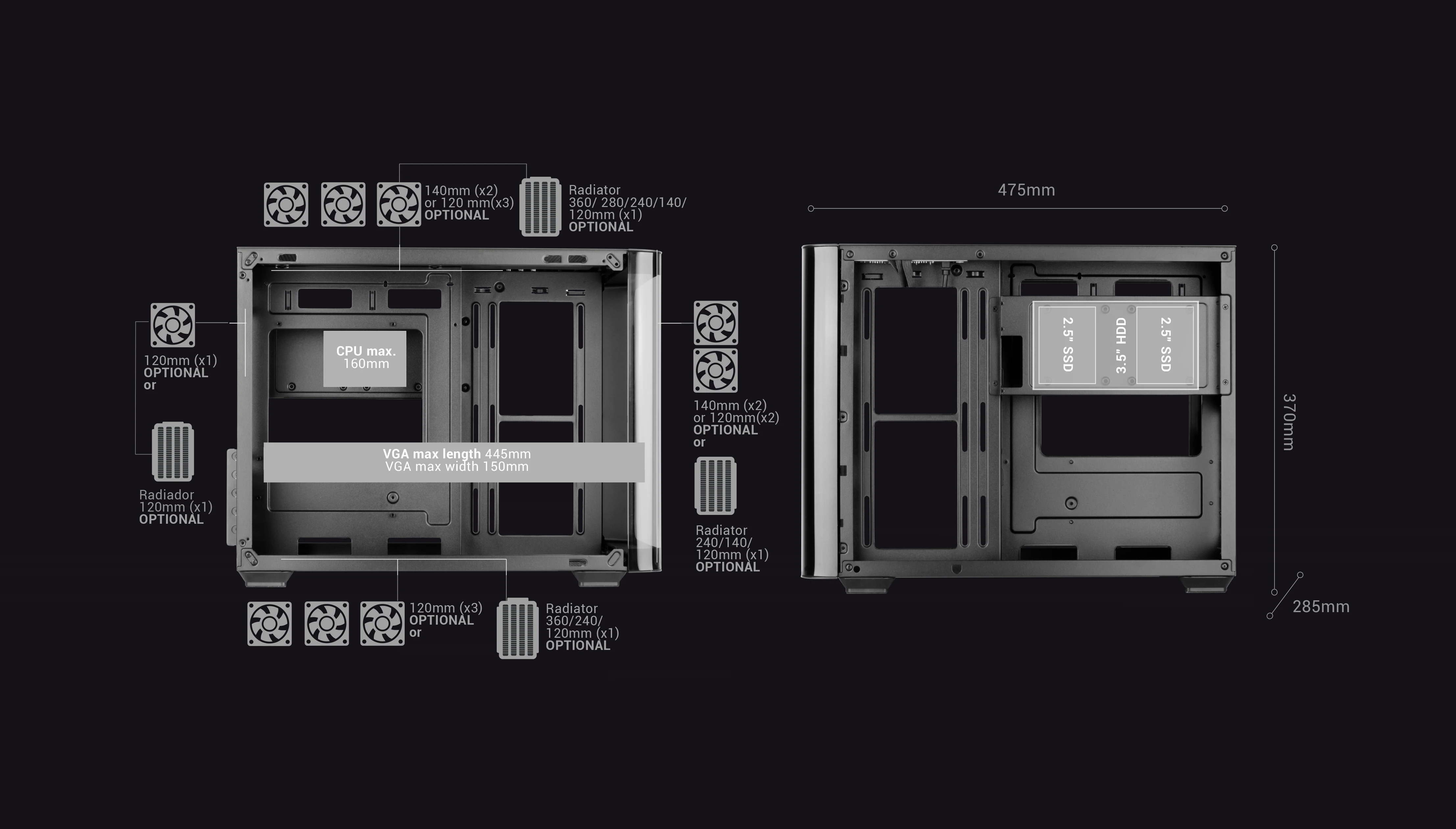 Espacio Interno Optimizado. La MC-FUSIONM está diseñada para configuraciones avanzadas en formato compacto. Es compatible con placas base Micro-ATX y Mini-ITX, y tiene capacidad de albergar tarjetas gráficas de hasta 445mm y disipadores de CPU de hasta 160 mm. Su sistema de gestión de cables asegura un montaje limpio y profesional, ideal para setups compactos de alto rendimiento.