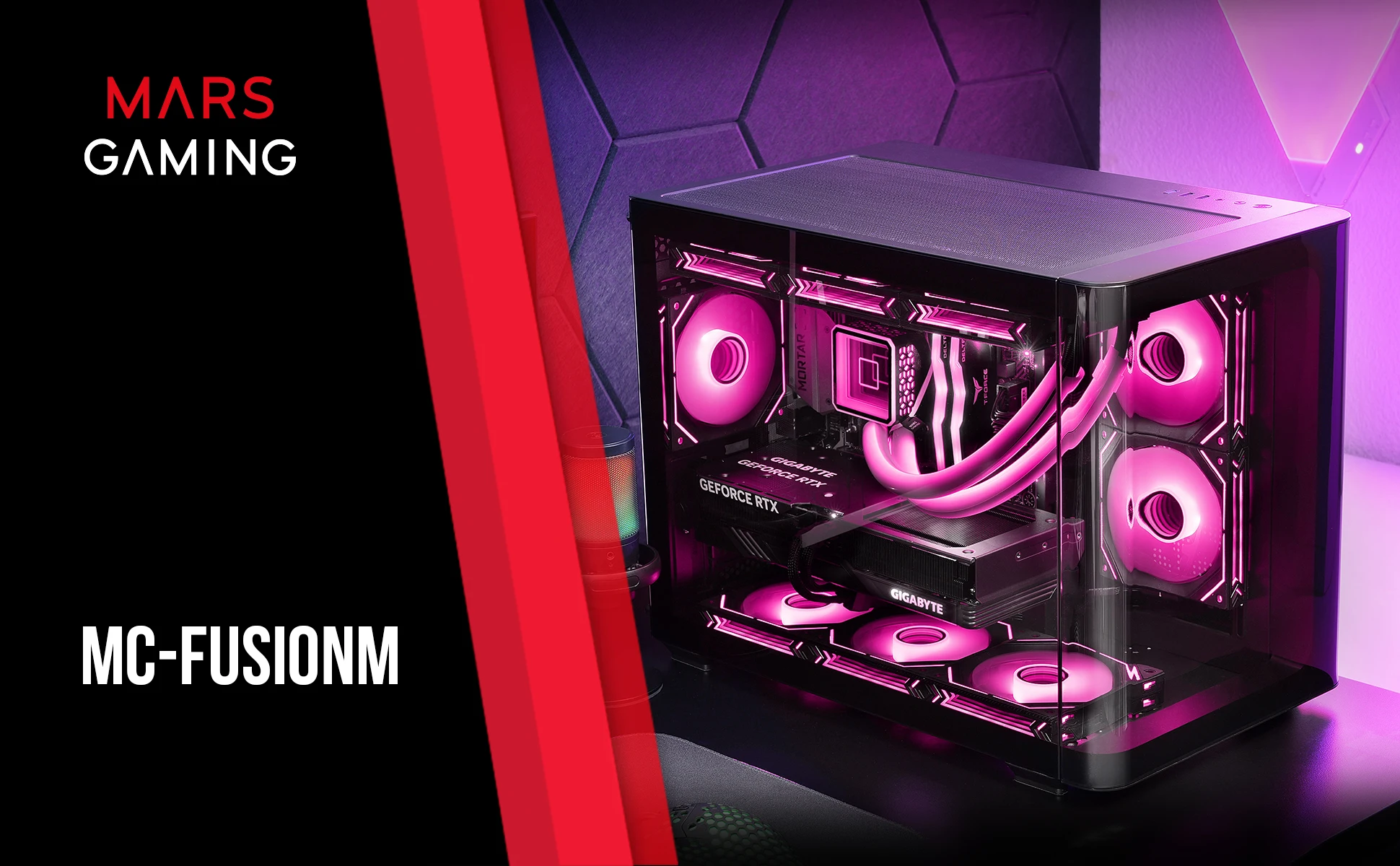 Caja Gaming Micro-ATX MC-FUSIONM. La MC-FUSIONM, con su exclusivo cristal curvado continuo, combina diseño y funcionalidad en una caja compacta Micro-ATX. Diseñada para setups que buscan un equilibrio entre rendimiento y espacio, ofrece soporte para hasta 9 ventiladores, refrigeración líquida de 360mm y un diseño de cámara doble para un interior limpio y organizado. Su enfoque CUSTOM te permite personalizar cada detalle para crear configuraciones avanzadas sin límites. Estilo, tecnología y rendimiento, todo en un formato más compacto.