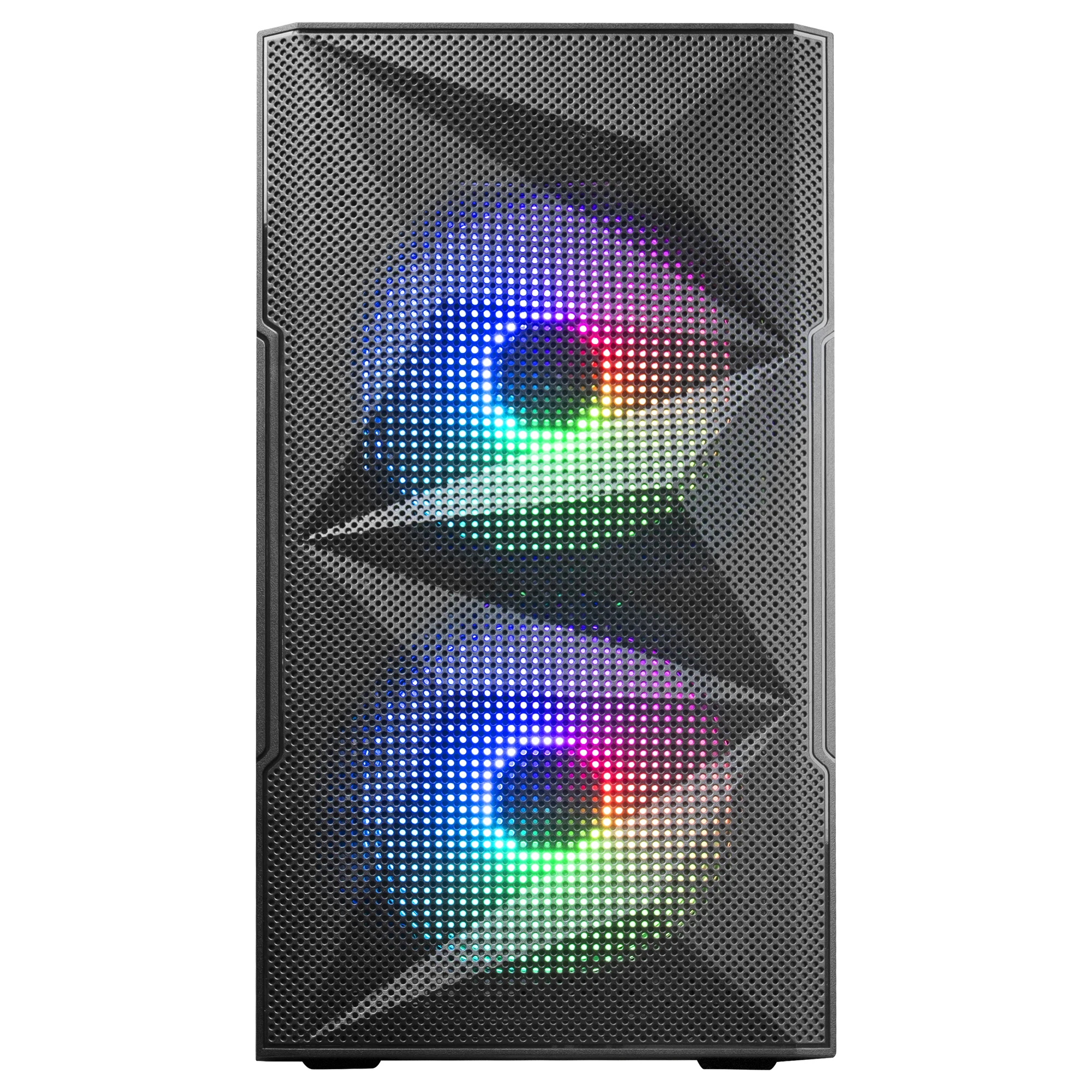DISEÑO GAMING ESPECTACULAR. La MC-ME es una declaración de innovación y estilo. Con un diseño que desafía los límites y una funcionalidad que eleva tu experiencia de juego, esta minitorre está lista para llevar tu PC al siguiente nivel. La rejilla frontal total-MESH con diseño geométrico maximiza el rendimiento y diseño, mientras que la ventana lateral de cristal templado te permite disfrutar de tus componentes internos en todo su esplendor. Cada detalle y cada componente queda al descubierto, permitiéndote disfrutarlos sin impedimentos. Además, los 2 ventiladores frontales FRGB añaden un toque de luz y movimiento a tu sistema.