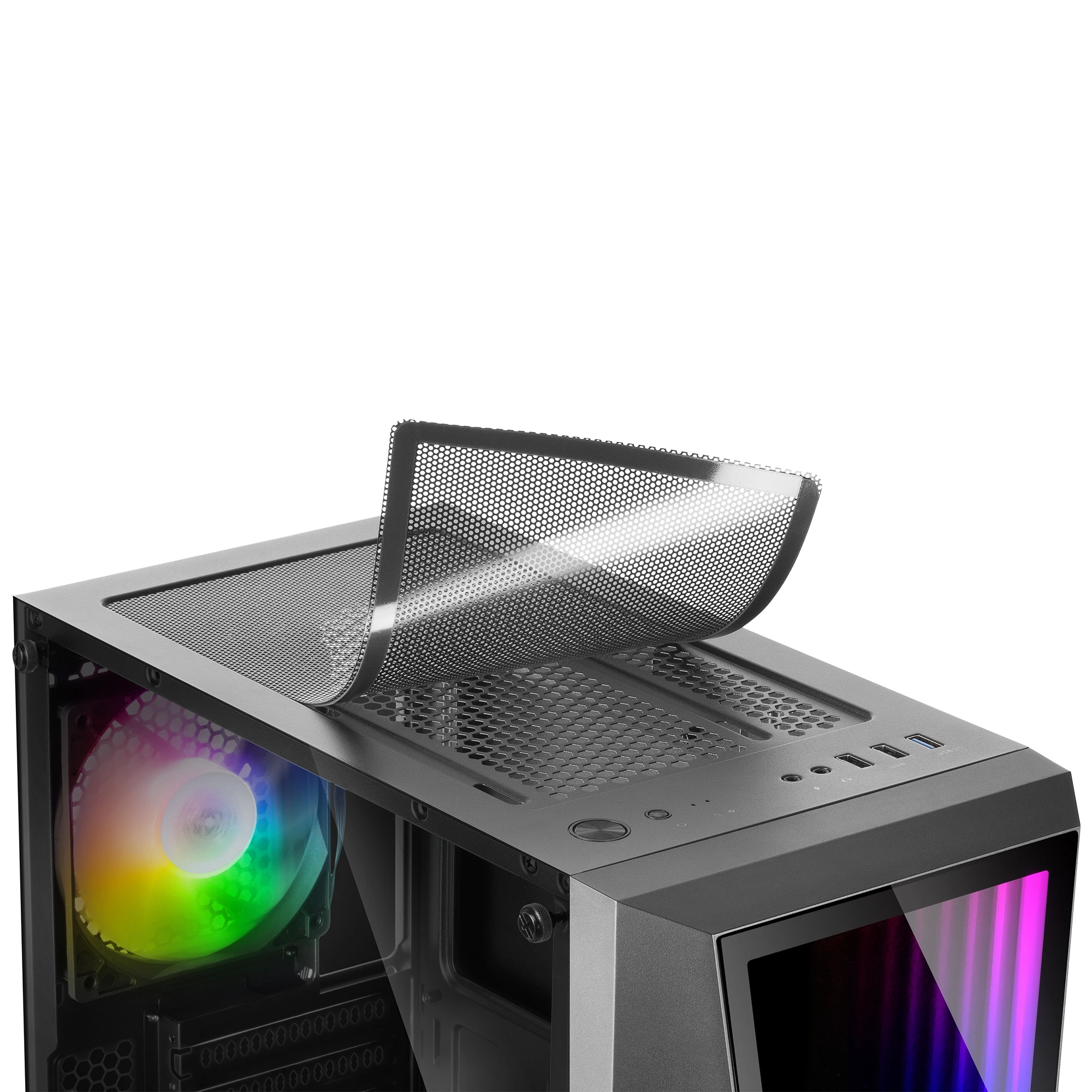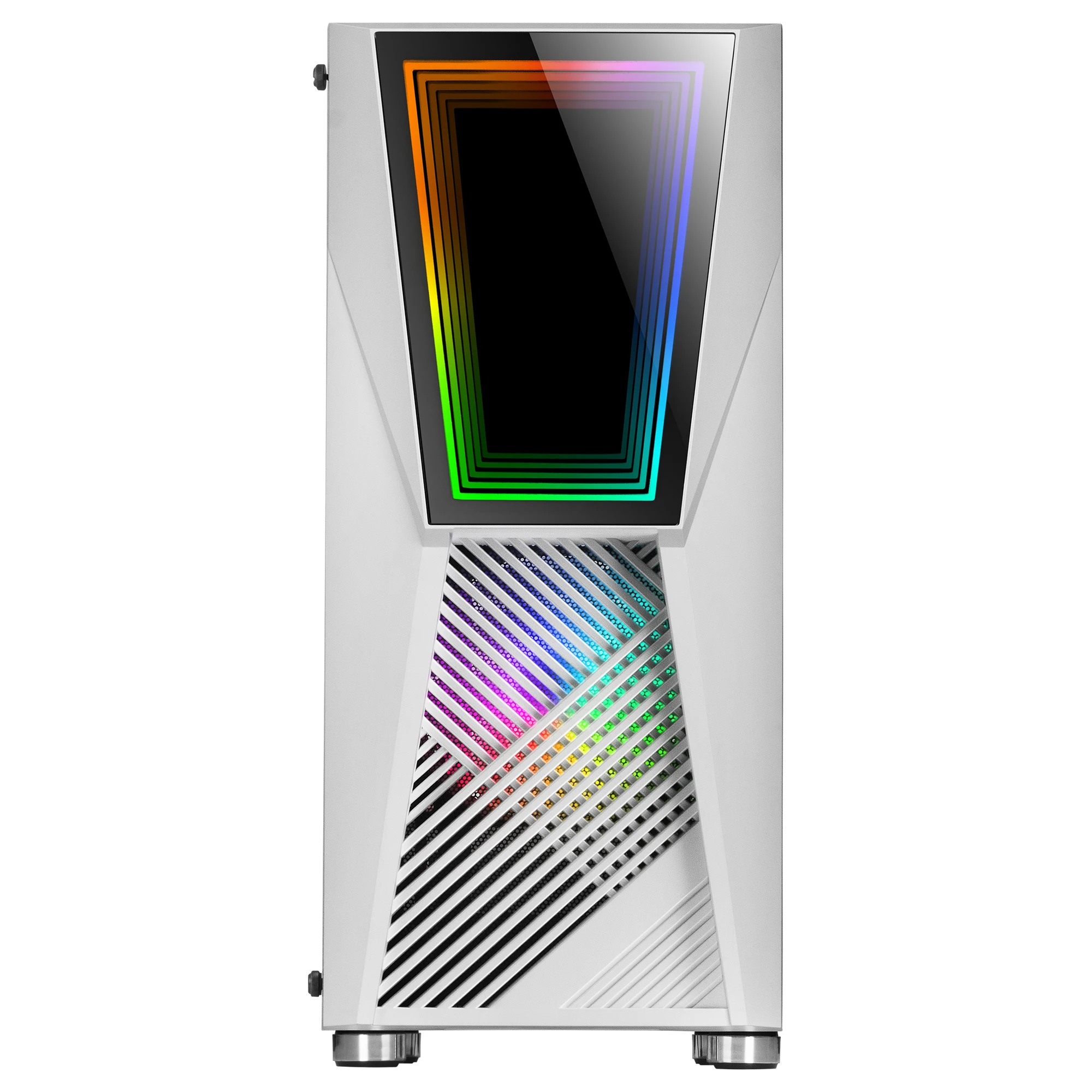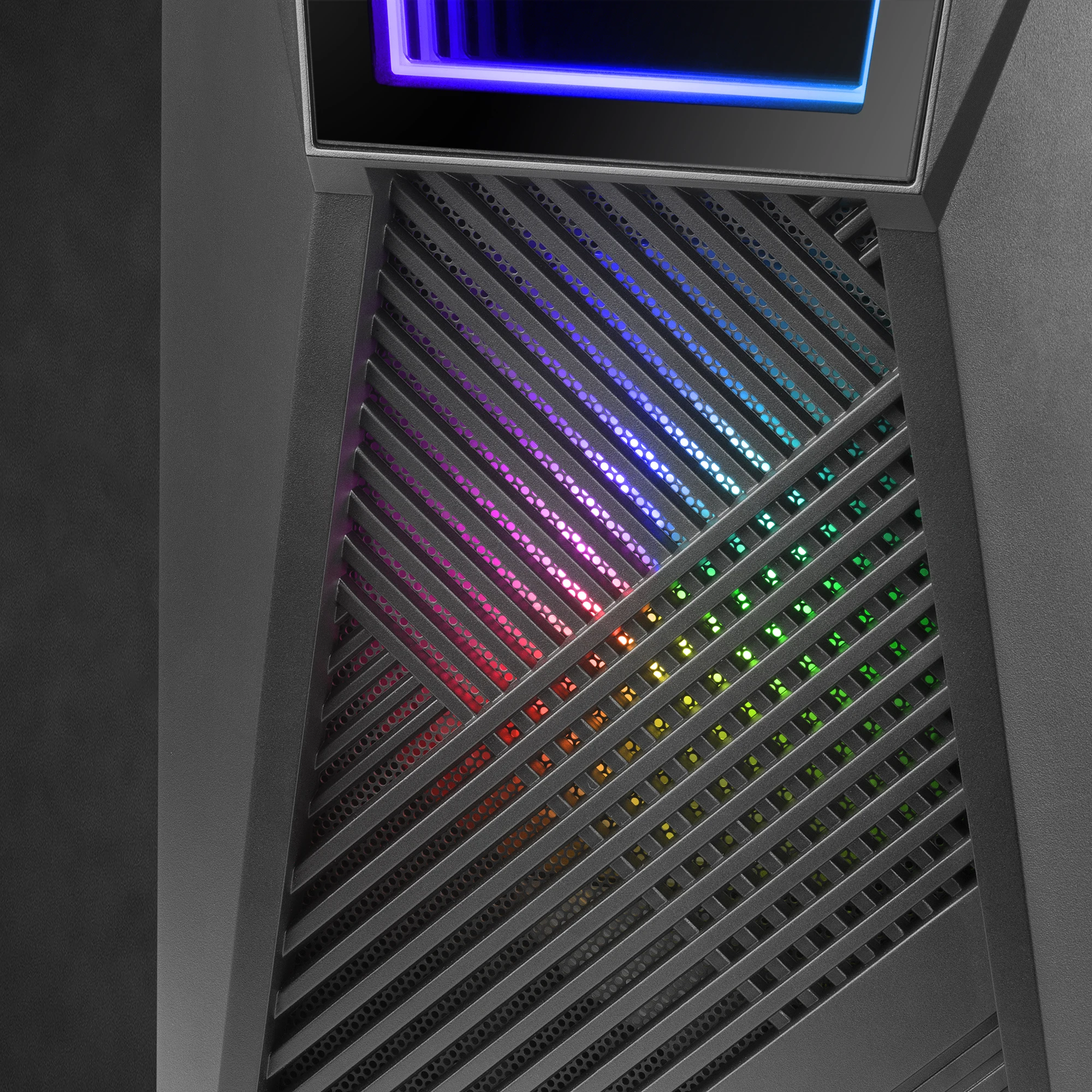 SEMITORRE GAMING PREMIUM MC777. Déjate hipnotizar por su ESPEJO INFINITO ARGB mientras disfrutas de una potente refrigeración doble de serie y espacio de sobra para todos tus componentes. Infinity Mirror ARGB: Su frontal cuenta con un espejo multicapa con iluminación ARGB que te hipnotizará con un efecto de profundidad infinita. Elige fácilmente entre los 17 modos predefinidos sincronizados con los dos ventiladores incluidos o utiliza el conector ARGB para controlar todo el sistema con una controladora o placa base ARGB. Elige el modo que mejor se adapte a tu setup y disfruta de una infinita gama de posibilidades estéticas. Refrigeración avanzada de serie: Un flujo de aire constante es la clave para extender la vida útil de tus componentes y hacer que tu sistema funcione a pleno rendimiento. La MC777, elimina todo problema de temperatura manteniendo el silencio gracias a un flujo de aire constante que ofrecen sus 2 ventiladores de 120 mm preinstalados (1 frontal y 1 trasero) y sus aperturas sin restricción de flujo. Además puedes ampliar hasta 6 el número de ventiladores para maximizar la refrigeración. Ventana cristal templado: Dotada de una ventana completa de cristal templado, la caja MC777 permite mostrar tu PC en todo su esplendor. Gran capacidad: MC777 te ofrece un gran espacio interno para la instalación de componentes de alto rendimiento, ofreciendo soporte para placas ATX, microATX y mini-ITX, soporte para refrigeraciones líquidas hasta 240mm, hasta 3 discos SSD de 2.5" y 2 discos HDD de 3.5", y una gestión de cableado interno totalmente eficiente.