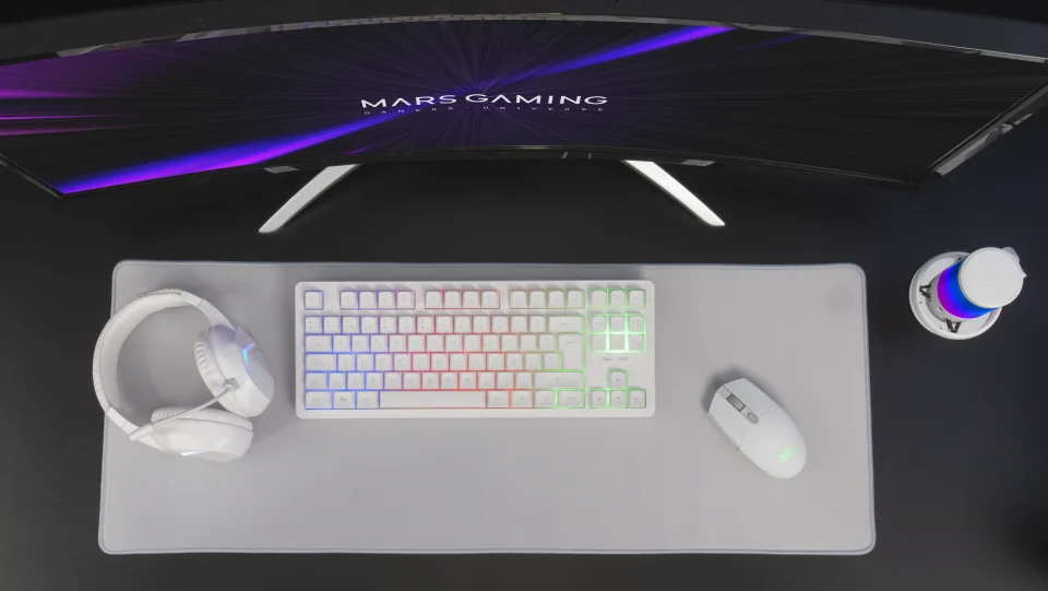 COMBO GAMING 4EN1 MCP-RGB3. Pack gaming premium 4en1: Teclado TKL con tecnología H-Mech RED, ratón ultraligero RGB Flow de 3200 DPI con switches HUANO, auriculares con iluminación FRGB Rainbow y almohadillas con cancelación de ruido, y alfombrilla XXL con base antideslizante. Compatible con múltiples plataformas, incluyendo PC y consolas, disfruta de sesiones de alto rendimiento. Disponible en negro, blanco y rosa.