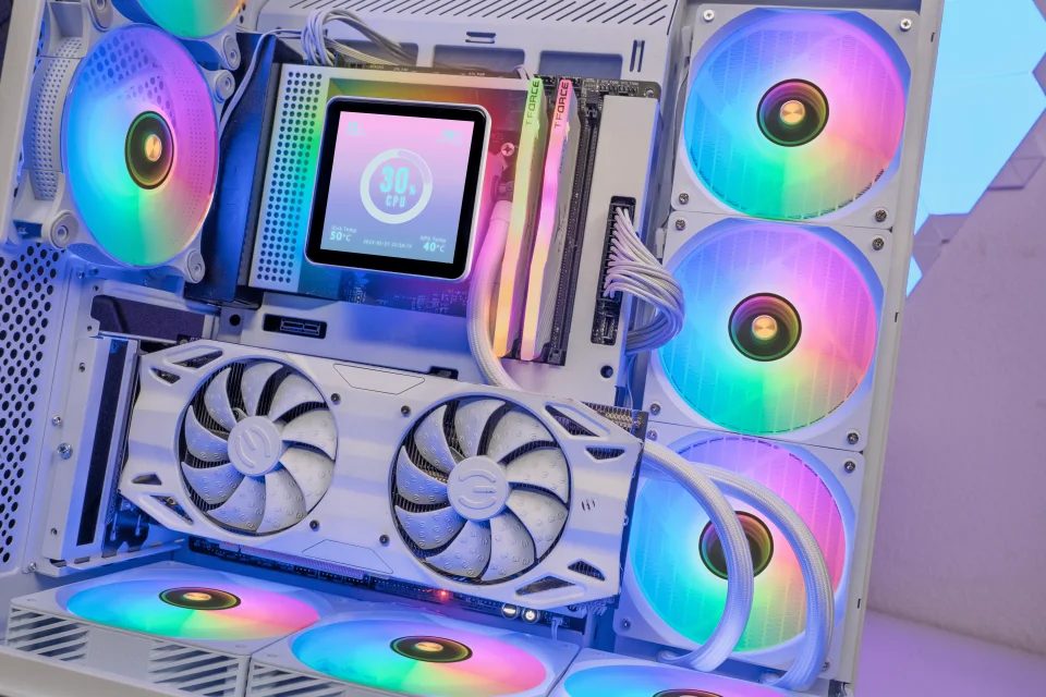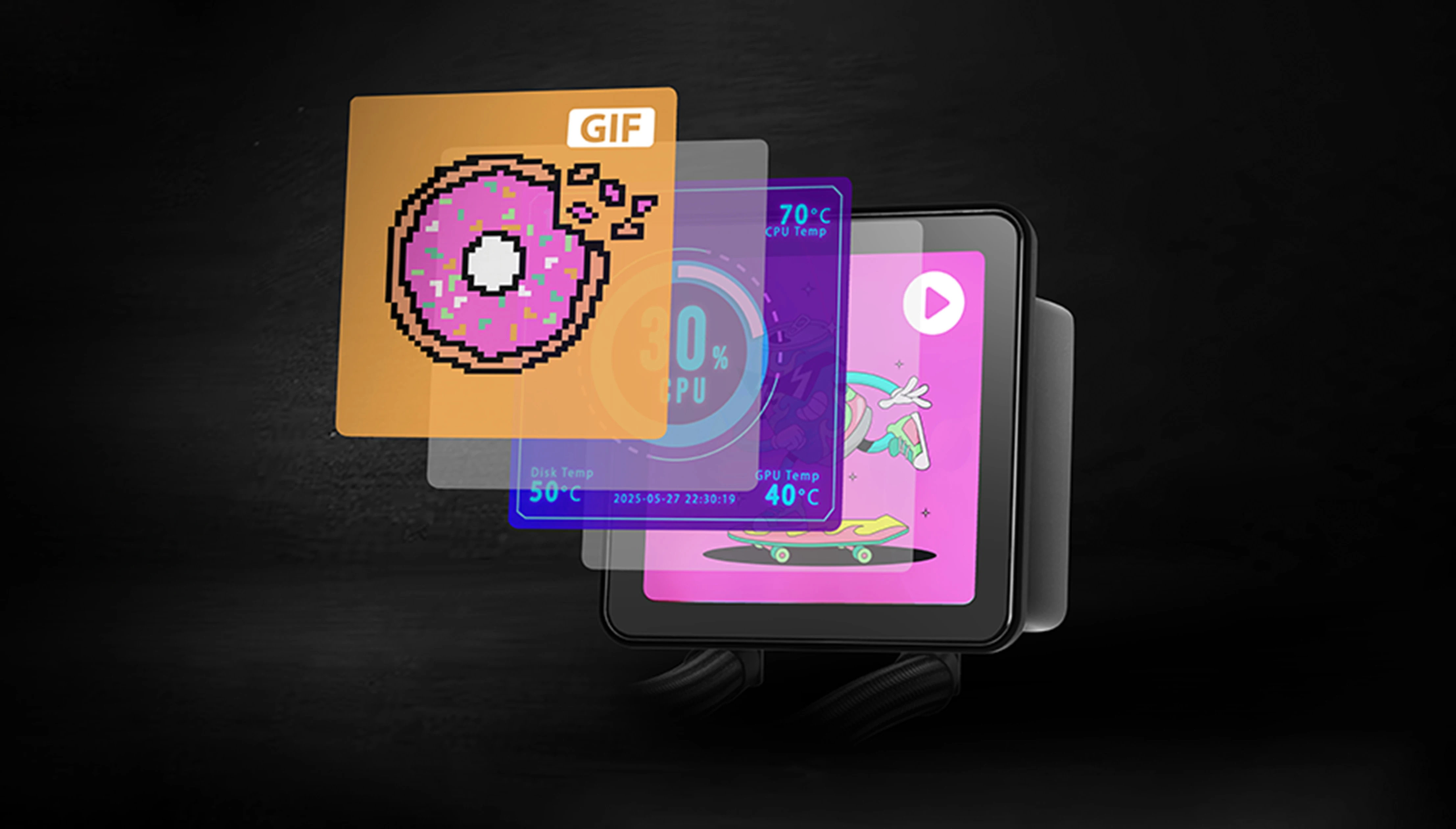 Pantalla IPS 4" Extraíble Magnética. La pantalla IPS de 4" ultrafina te permite mostrar en tiempo real imágenes, vídeos, animaciones GIF o estadísticas del sistema mediante software de control avanzado. Gracias a su base magnética, puedes colocarla donde quieras: dentro o fuera del chasis, sobre la mesa o en una zona visible de la torre.