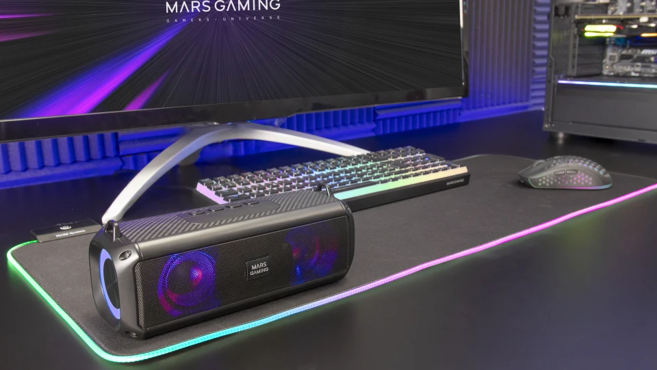 ILUMINACIÓN RGB DINÁMICA. Experimenta un espectáculo visual con la deslumbrante iluminación RGB dinámica del altavoz MSB-XT. Más que una simple característica estética, la iluminación RGB realza tu experiencia de sonido, proporcionando un despliegue de colores vibrantes y dinámicos. Diseñada para establecer el tono ideal para cualquier ocasión, esta iluminación crea un ambiente único, acompañando tu música, películas o juegos favoritos con un toque de color y elegancia.