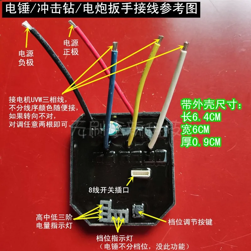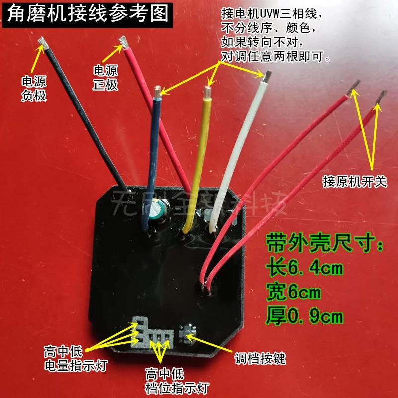 Sierra de cadena eléctrica sin escobillas con chip importado de 12 tubos de alta potencia/tablero de control de taladro percutor eléctrico (entregada con carcasa de aluminio, tamaño ancho 6 * largo 6.4CM*grosor 0.9 CM), 36 V (completamente cargadas 42 V, baterías duales, dos baterías de 18 V Úselas al mismo tiempo), aproximadamente 1700 W, se pueden usar con varias marcas de modelos sin escobillas y sin salón.El cableado es muy sencillo: el cable rojo del cable de alimentación está conectado al polo positivo y el cable negro está conectado al polo negativo.Conecte los cables trifásicos del motor a voluntad (si la dirección está invertida, cambie dos cables cualesquiera), consulte el diagrama de cableado a continuación para obtener más detalles (sin luz indicadora de batería).El tablero de control de la motosierra eléctrica tiene dos cables conectados al interruptor original de la máquina.Para el cableado, consulte el diagrama de cableado de la amoladora angular a continuación; El tablero de control del taladro percutor eléctrico tiene un interruptor de 8 cables.Debe tener un interruptor de velocidad iluminado de 8 cables para usarlo.Otros enlaces en la tienda.