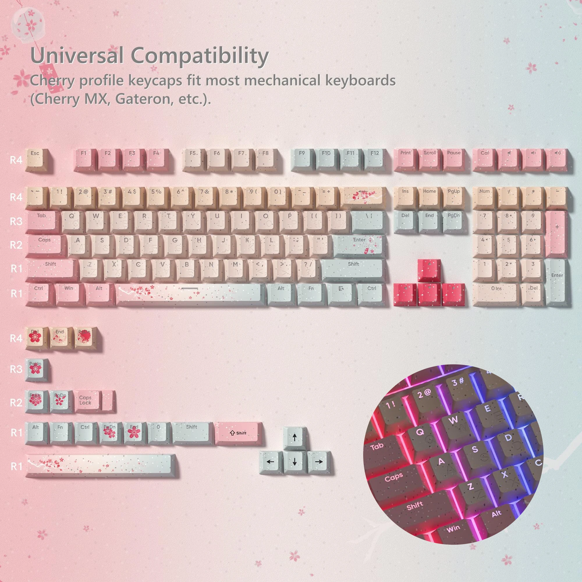 【Tecla de perfil Cherry】 Diseño clásico.De manera ergonómica, no se cansará después de un uso prolongado.Diseño ergonómico de altura cereza, diseñado para teclados mecánicos retroiluminados/no retroiluminados.
