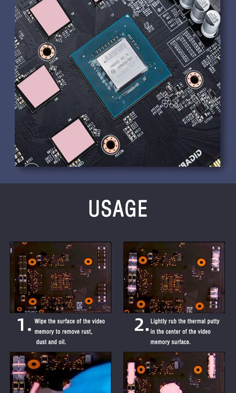 1.16,8 W/MK La masilla térmica ilimitada es una pasta térmica pegajosa/goma de alta calidad diseñada para usar en chips de memoria y GPU de varias computadoras.
