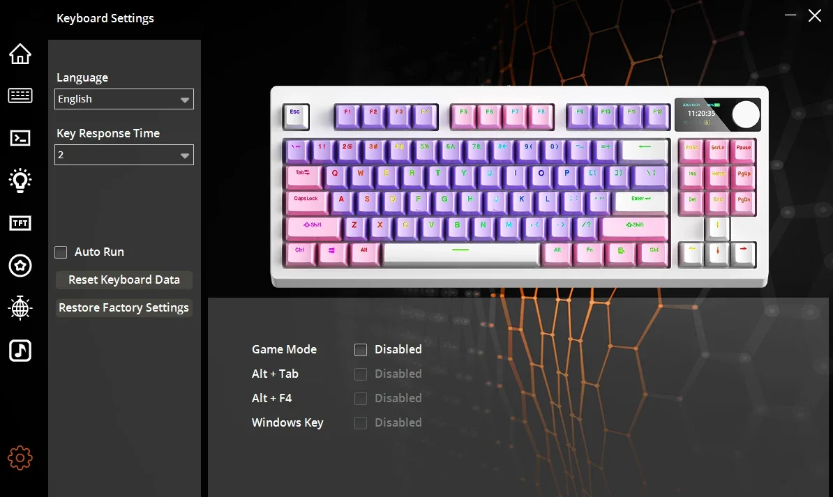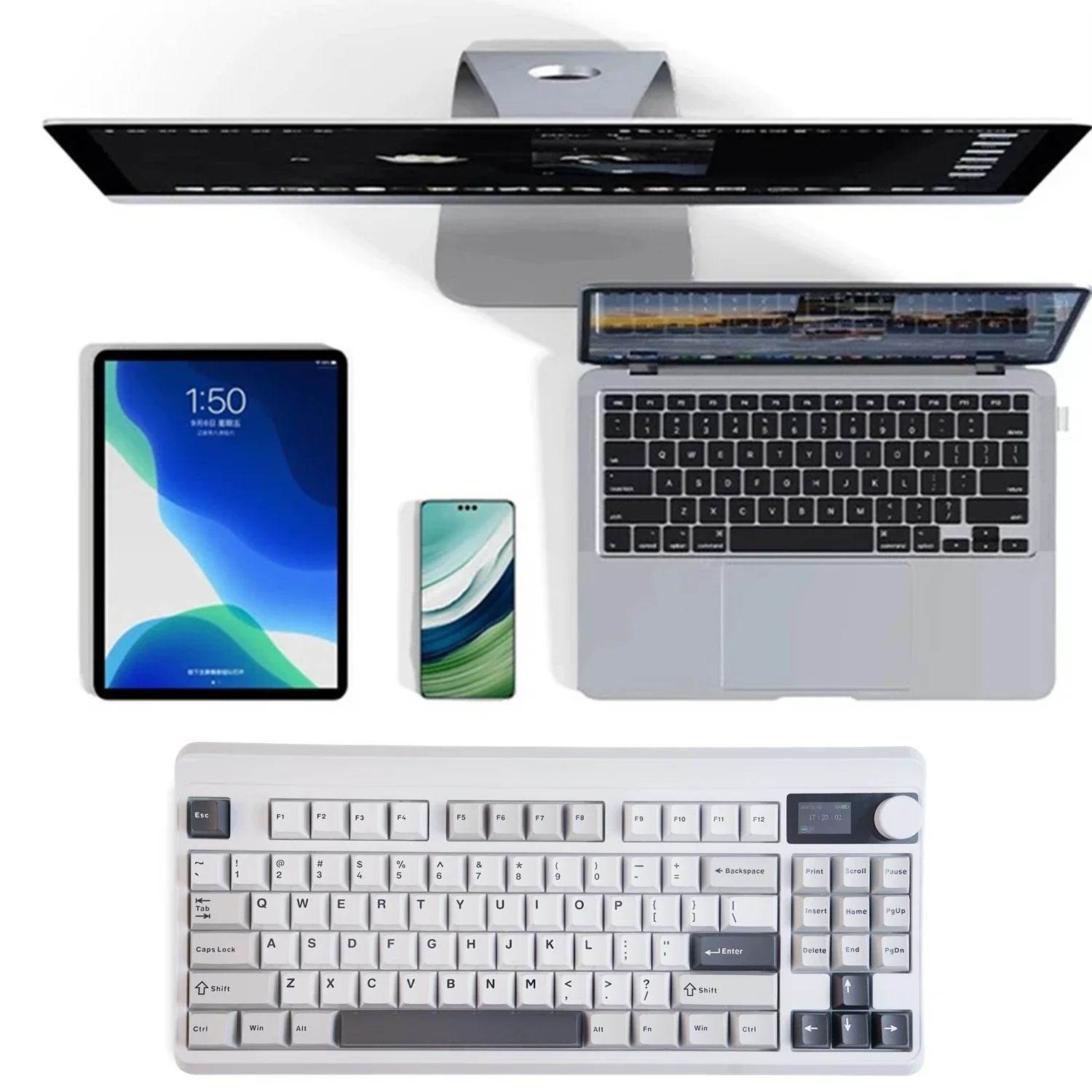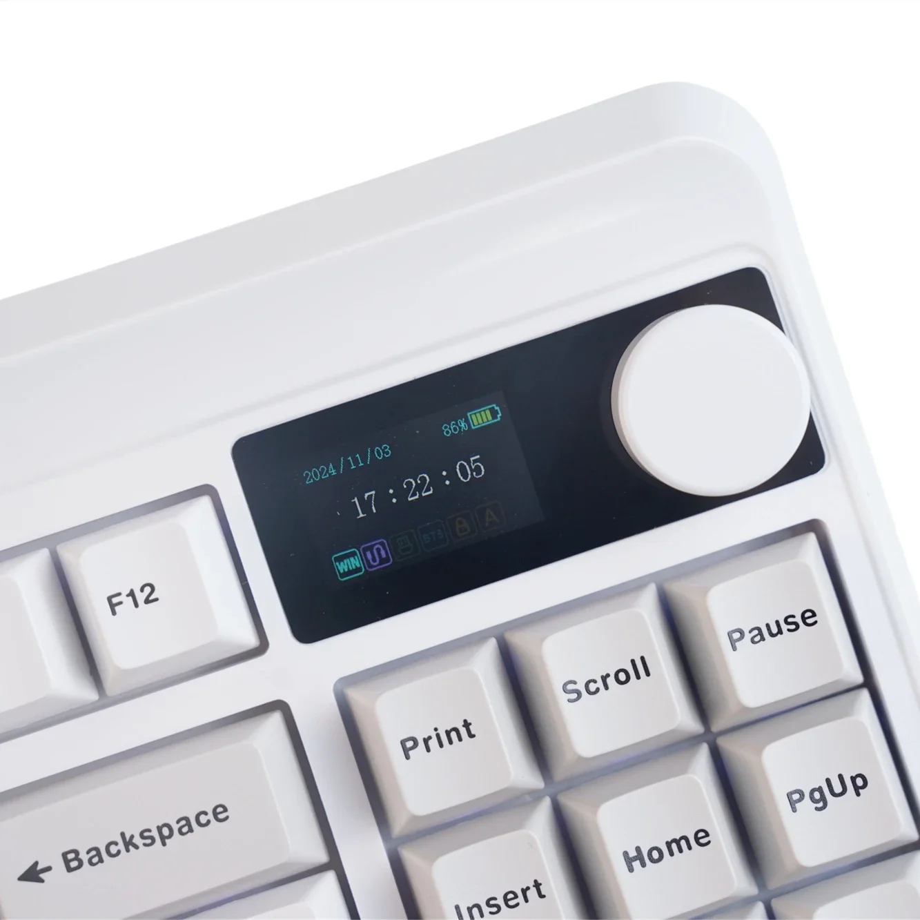 The MK86 Pro keyboard knob is not only for the convenience of adjusting the volume, but also to controling rgb and display. The minimalist design style and smooth rotating feel make every operation a pleasure. It is not only a tool, but also a pleasure.The Programmable display can show you date,time ,battery percentage,connection mode and you can also upload gif picture.