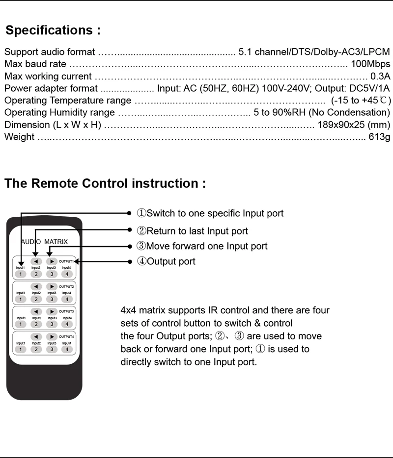 Comprar Matriz de Audio 4x4, conmutador divisor SPDIF /TOSLINK, Audio óptico Digital 4 en 4, Selector de matriz verdadera, Control remoto
