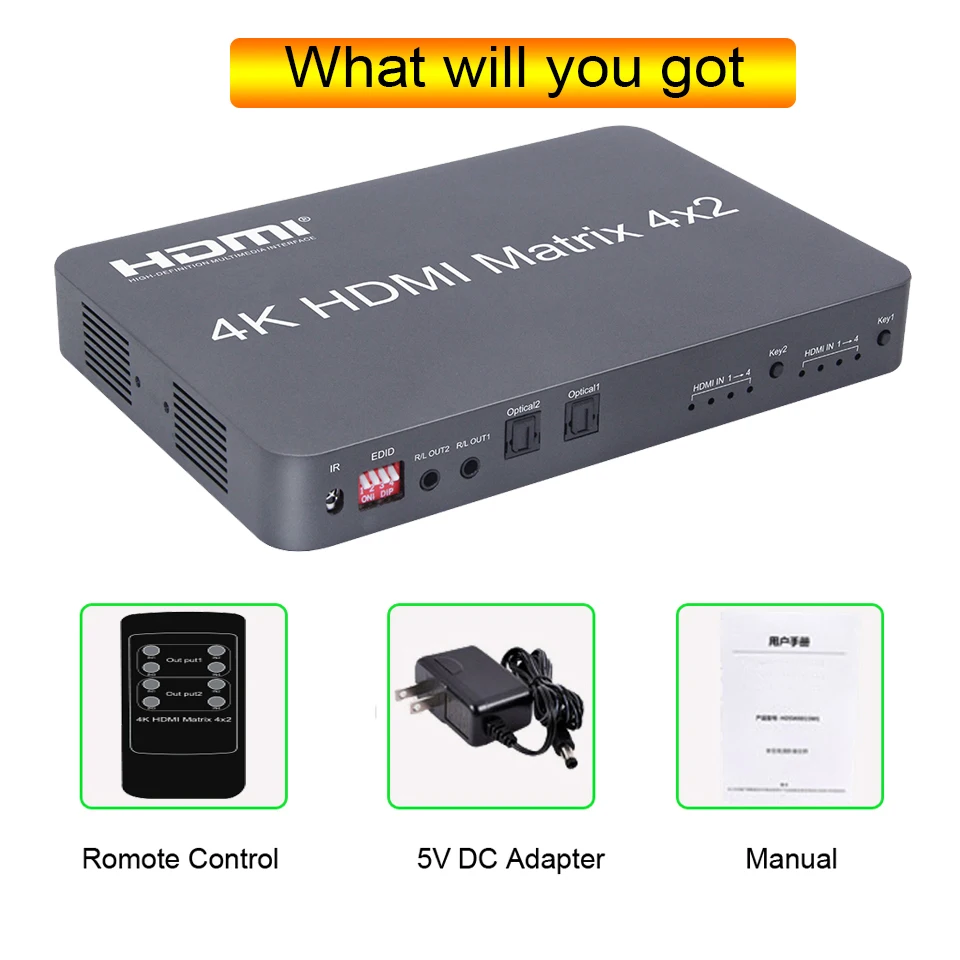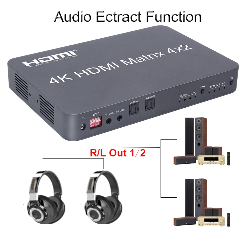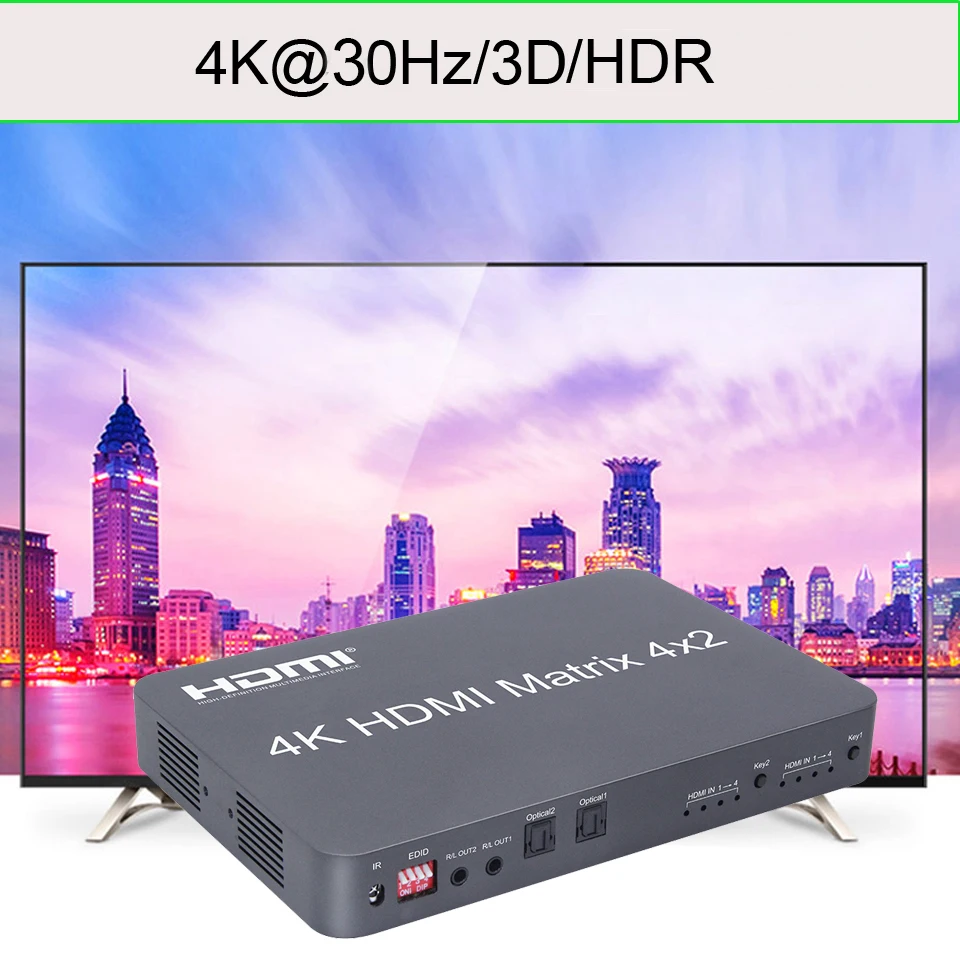 HDMI Matrix 4x2 4K @ 30Hz HDR Switch Splitter 4 en 2 salidas SPDIF óptico 3,5mm Jack Extractor de audio HDMI Switcher para PS3 PS4 HDTV