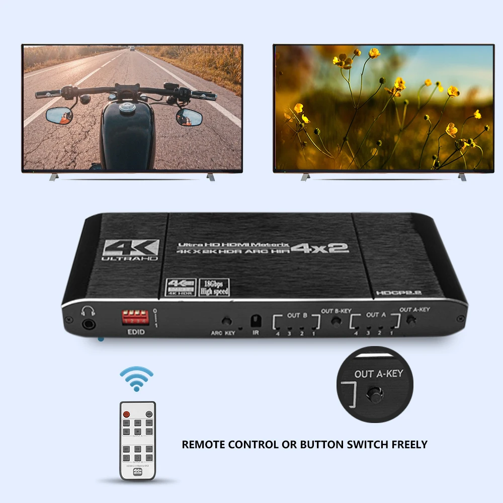 El 4K 4x2 HDMIMatrix de HDmatters le permite distribuir cualquiera de las cuatro fuentes HDMI conectadas a una o ambas pantallas conectadas.Cumple totalmente con las especificaciones HDMI 2.0 y HDCP 2.2 y 1.4.