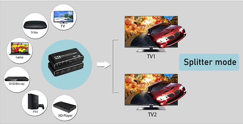 Estas matrices HDMI 2.0 combinan un divisor y un conmutador HDMI en 1.Con la matriz HDMI 2.0, puedes elegir cualquiera de las fuentes de vídeo conectadas y enviarla a la pantalla.