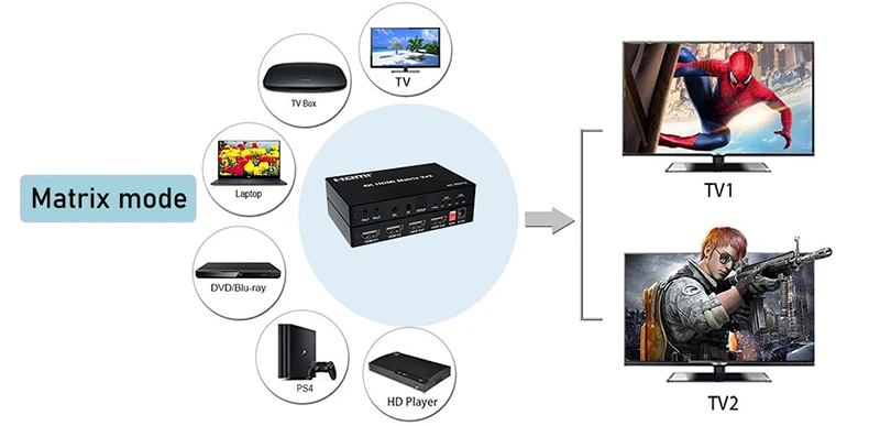 Estas Matrix son de una matriz HDMI True. Admite el modo Matrix y Splitter.En el modelo divisor, todas las salidas HDMI pueden mostrar un solo vídeo desde la fuente HDMI conectada.