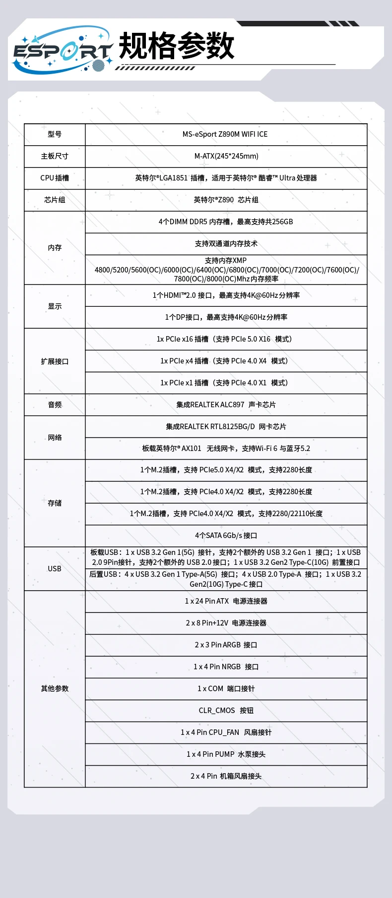Especificaciones: Tipo de placa: M-ATX Conjunto de chips: conjunto de chips Intel Z890 Soporte de CPU: Intel®Ranura LGA1851, adecuada para Intel® CoRE™ Ultra procesador Soporte de memoria: 4x ranuras DIMM DDR5 Chip de tarjeta de red: Realtek® Tarjeta de red RTL8125BG/D; Intel a bordo® Tarjeta de red inalámbrica AX101, compatible con Wi Fi 6 y Bluetooth 5.2 Interfaz de disco: 1 ranura M.2, admite modo PCIe 5.0 X4/X2, admite 2280 de longitud; 1 ranura M.2, admite modo PCIe 4.0 X4/X2, admite longitud 2280; 1 ranura M.2, admite modo PCIe 4.0 X4/X2, admite longitud 2280/22110; 4 interfaces SATA de 6 Gb/s Ranura PCIe: 1 ranura PCIe x16 (compatible con el modo PCIe 5.0 X16); 1 ranura PCIe x4 (compatible con el modo PCIe 4.0 X4); 1 ranura PCIe x1 (admite el modo PCIe 4.0 X1) Interfaz USB: USB integrado: 1xUSB 3.2 pines Gen 1 (5G), admite 2 USB 3 adicionales.2 interfaces Gen 1;1 USB 2.0 conector de 9 pines, compatible con 2 USB 2 adicionales.0 interfaces;1 USB 3.2 interfaz frontal Gen2 tipo C (10G);USB trasero: 4 x USB 3.Interfaz 2 Gen 1 tipo A (5G);4 USB 2.0 Interfaces tipo A;1 USB 3.2 Interfaz tipo C Gen2 (10G) Interfaz de audio: códec de audio de alta definición Realtek ALC897 Interfaz de vídeo: 1x HDMI™ 2.0, 1x DP