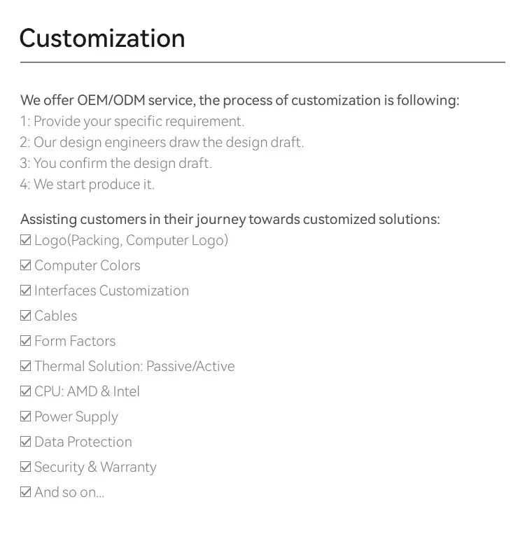 P1: ¿Puedo poner nuestro logotipo (nombre) en su producto? R: Por supuesto, ofrecemos servicio OEM. P2: ¿Cuánto tengo que pagar por su servicio OEM? R: El costo adicional para OEM especial es de 500 $, pero esto sería FOC si su pedido llega a 500 por lote. P3: ¿Qué términos de pago/comercio aceptan? R: bajo FOB shenzhen o HK, generalmente el pago contra entrega, o paypal, una cantidad mayor deberá seguir oficial Cotización/acuerdos. P4: ¿Cuál es la cantidad mínima de pedido?(MOQ) R: Podemos vender una muestra de una pieza para su prueba. P5: ¿Cuál es la base de precios? R: Nuestro precio se basa en especificaciones detalladas como RAM, HD/SSD, tarjeta WIFI, etc. El rango de precios en Alibaba básicamente cubre todas las especificaciones, así que Contáctenos primero con su especificación detallada antes de lanzar su pedido.