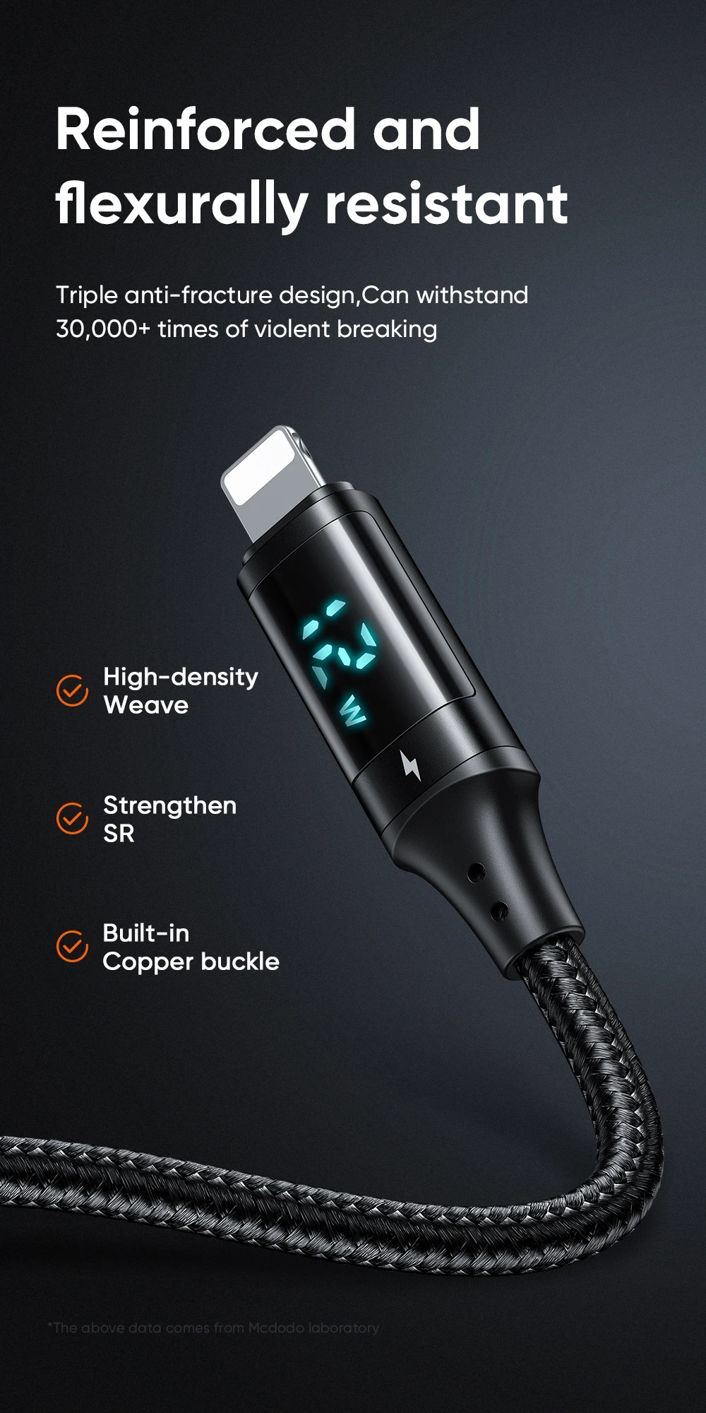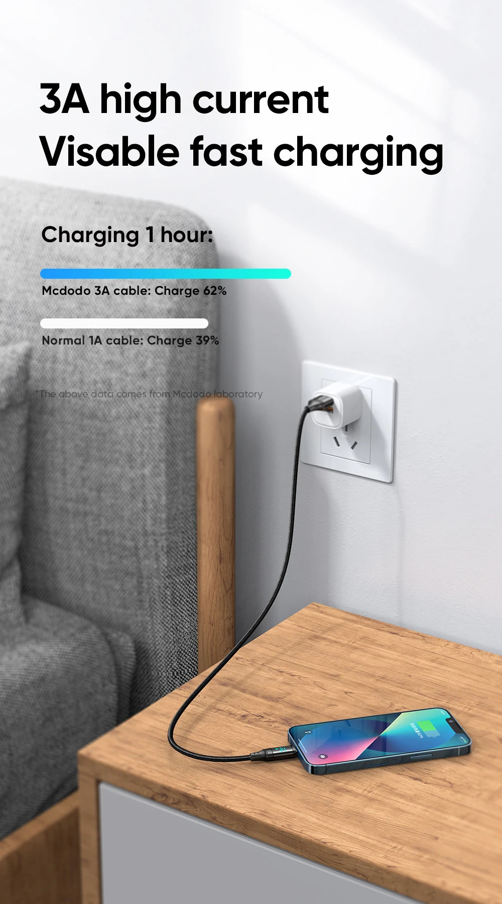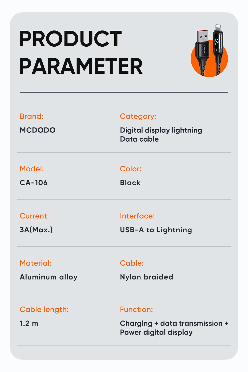Mcdodo-Cable USB de carga rápida para teléfono móvil, dispositivo de 12W, 3A, para iPhone 14, 13, 12, 11 Pro Max, XR, X, 8, 7, 6, iPad, pantalla Digital LED