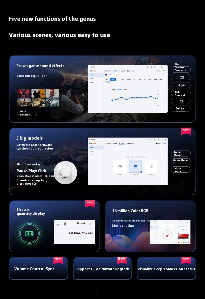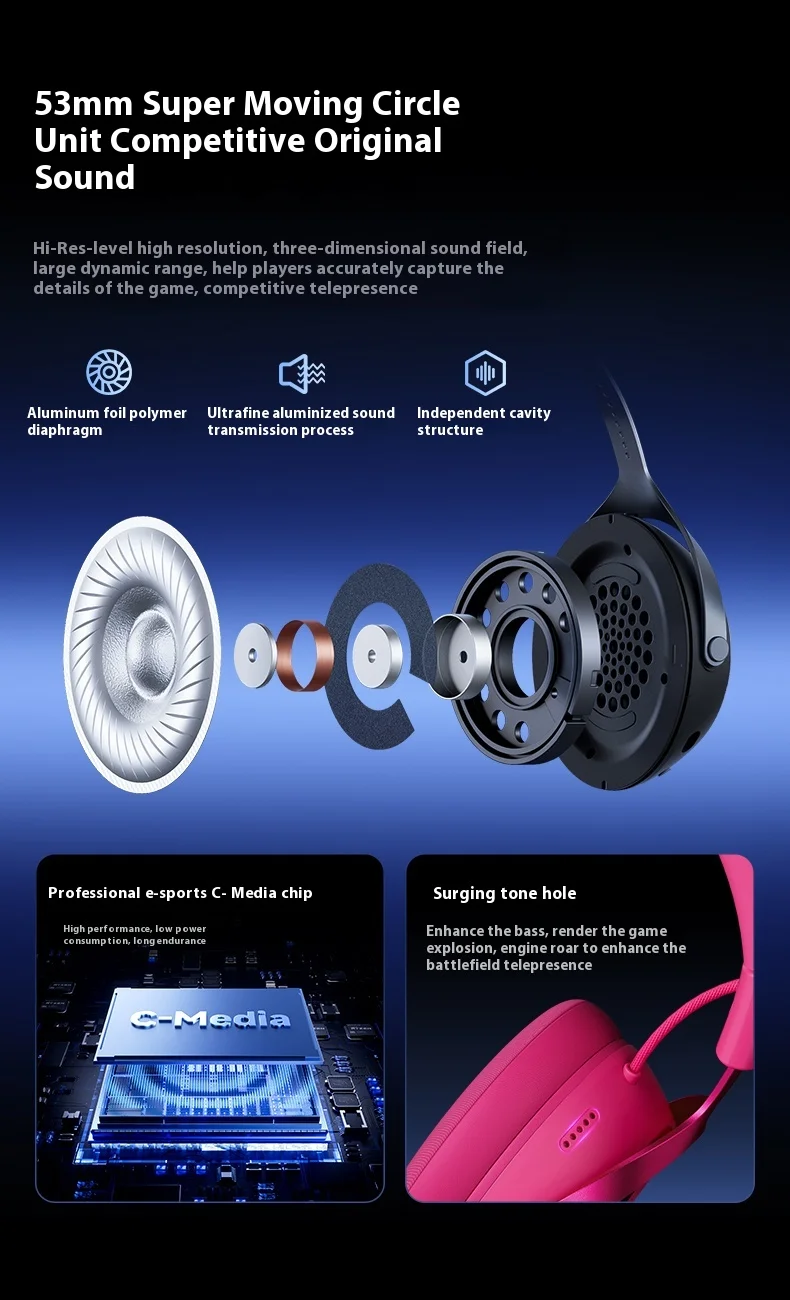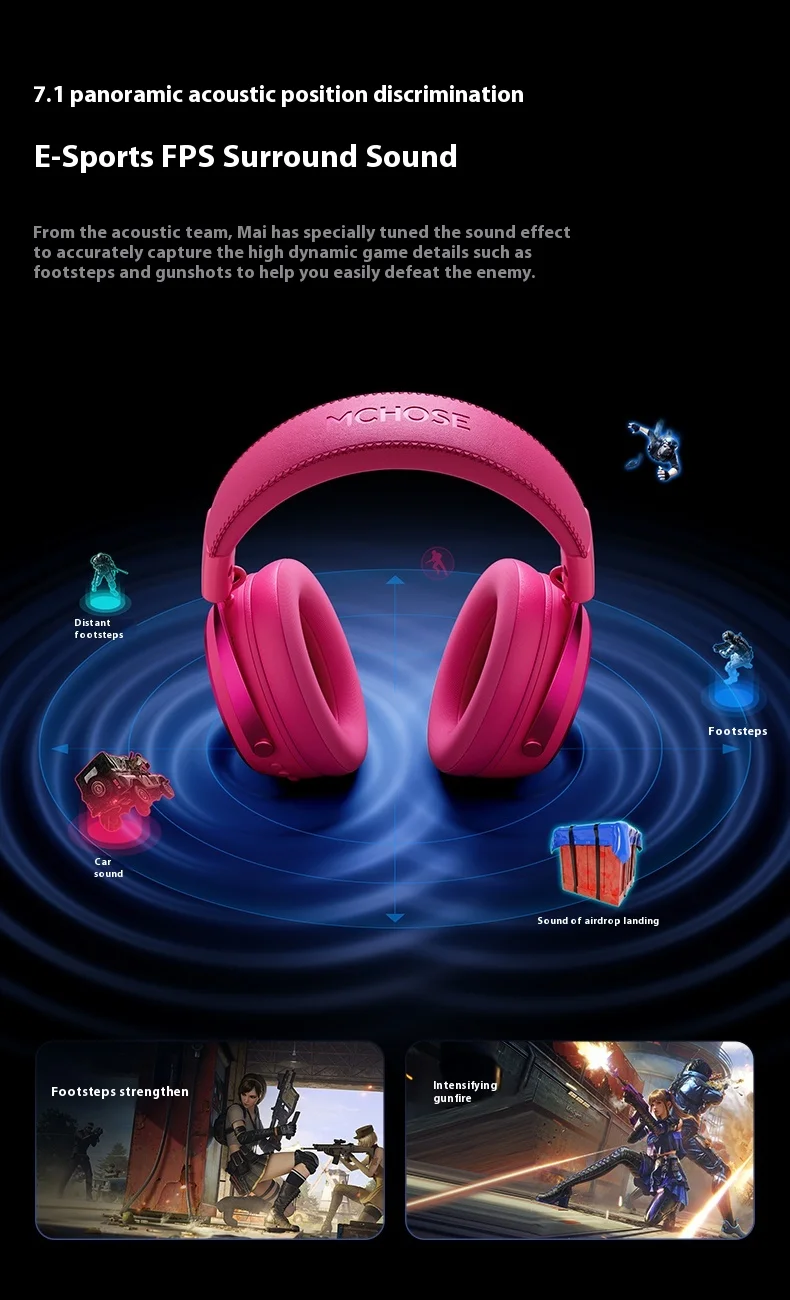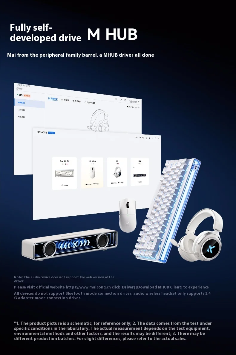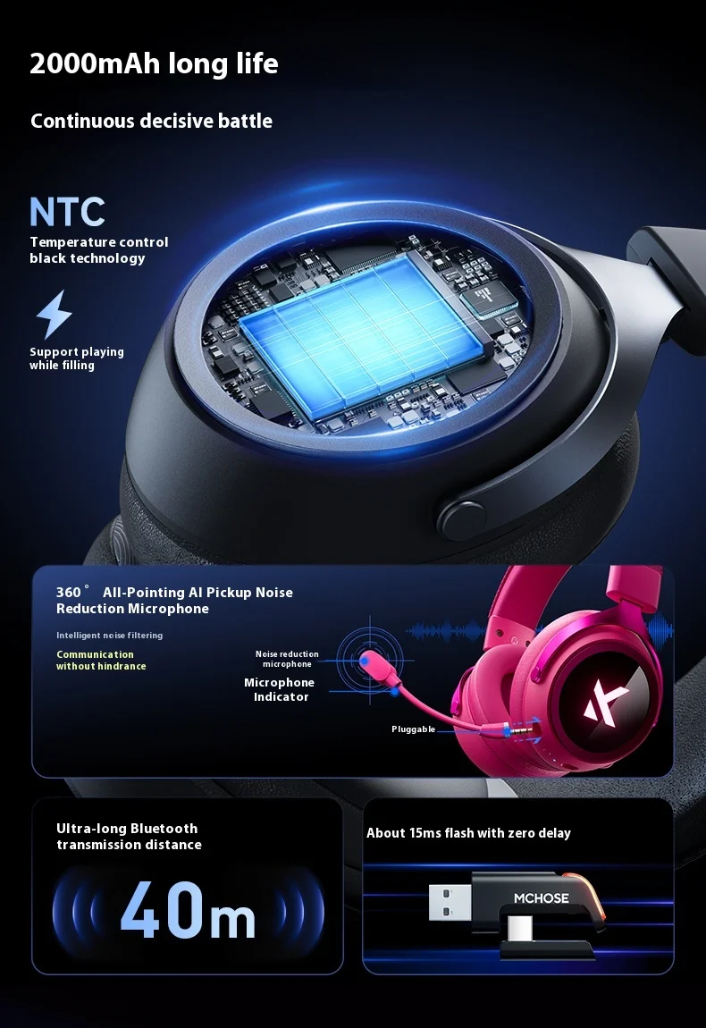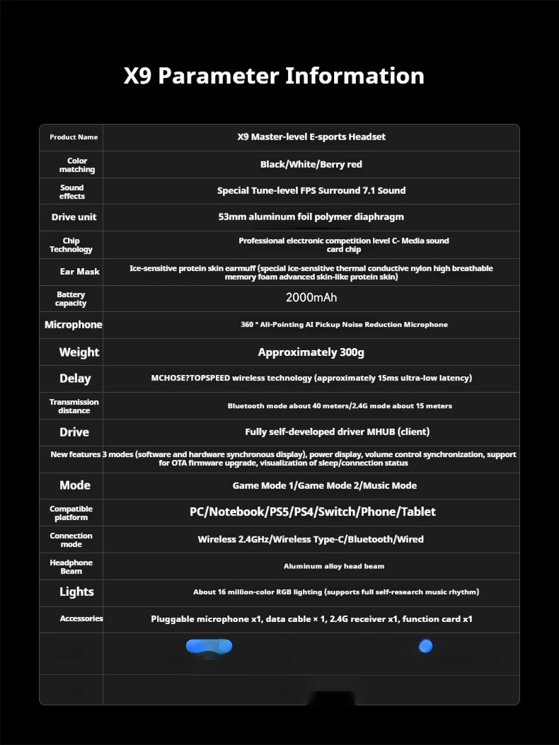 MCHOSE X9 Auriculares Esports Inalámbricos Bluetooth 2,4G 2000mAhC-Media FPS Auriculares para juegos de computadora de escritorio de bajo retardo PCAuricularNombre del producto: Auriculares Esports de nivel maestro X9 Esquema de colores: Negro/Blanco/Rojo Bero Efecto de sonido: efecto de sonido FPS envolvente 7.1 de grado esports especialmente sintonizado Unidad motriz: diafragma de polímero de papel de aluminio de 53 mm Tecnología de chip: chip de tarjeta de sonido C-Media de grado profesional para juegos Almohadillas para los oídos: almohadillas para los oídos con proteínas sensibles al hielo (nylon conductor térmico sensible al hielo especialmente fabricadas + esponja viscoelástica altamente transpirable + piel avanzada como piel proteica) Capacidad de la batería: 2000 mAh Micrófono: 360° Micrófono omnidireccional con cancelación de ruido de captación AI Peso: Aproximadamente 300 g Retraso: MCHOSO° Tecnología inalámbrica TOPSPEED (latencia ultrabaja de aproximadamente 15 ms) Distancia de transmisión: modo Bluetooth de unos 40 metros/modo 2,4G de unos 15 metros Controlador: Controlador totalmente desarrollado M HUB (cliente) Nuevas características: 3 modos (visualización sincronizada de software y hardware), visualización del nivel de batería, sincronización del control de volumen, soporte para actualización de firmware OTA, visualización del estado de suspensión/conexión Modo: Modo de juego 1/ Modo de juego 2/Modo de música Plataformas compatibles: PC/portátil/PS5/PS4/conmutador/teléfono/tableta Modo de conexión: Inalámbrico 2,4 GHz/Inalámbrico Tipo C/Bluetooth/Cableado Diadema para auriculares: Diadema de aleación de aluminio Iluminación: Aproximadamente 16 millones de colores de iluminación RGB (compatible con el ritmo musical de desarrollo propio de Maicong) Accesorios: enchufe el micrófono x1, cable de datos x1, receptor 2,4G x1, tarjeta de función x1