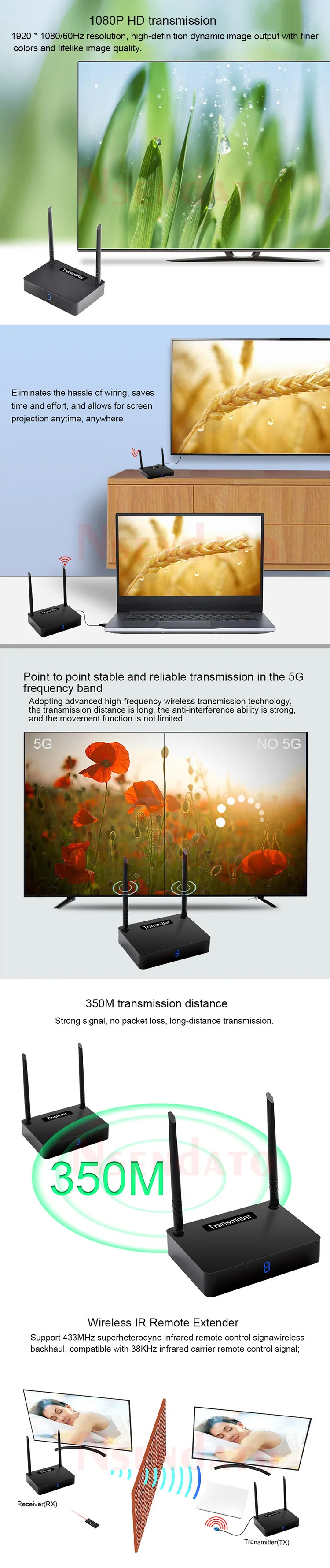 Measy HD585 5,8 GHz 350M/1150 pies HD inalámbrico AV Video Audio Transmisor Emisor receptor adaptador para PC TV Box DVD proyector