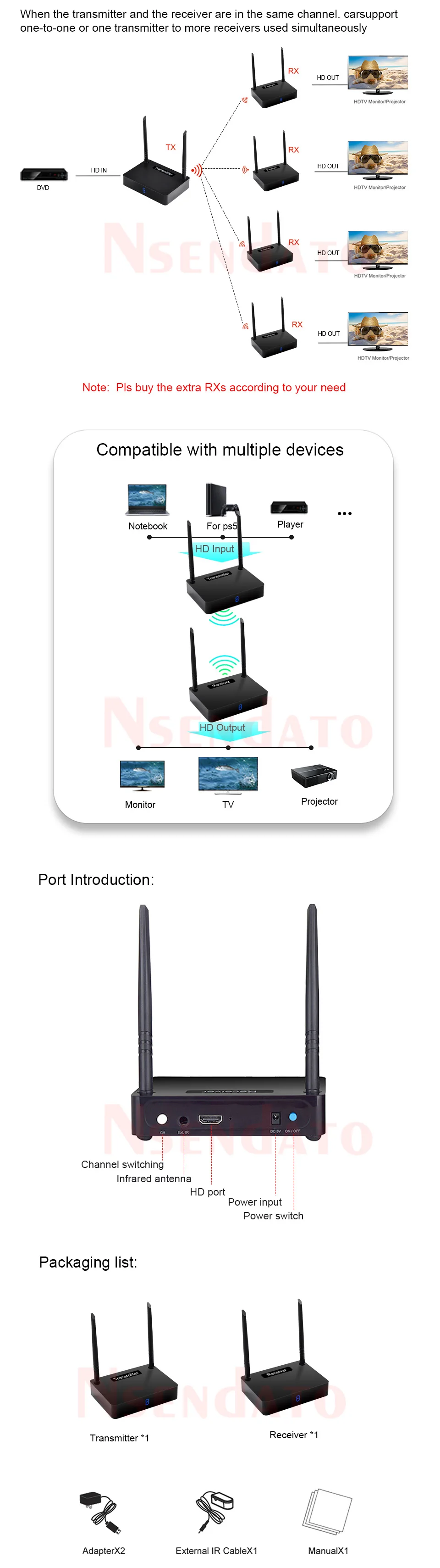 La transmisión inalámbrica HD HD585 es un transmisor inalámbrico para el entretenimiento de audio y video HD en el hogar. Consiste en un transmisor y un receptor. Por lo general, el decodificador HD del hogar debe conectarse a un televisor HD (o proyector) a través de un cable HD. El cable HD tiene un límite de longitud, y el decodificador también se coloca en una posición relativamente fija. Especialmente cuando se conecta a un proyector colgante, trae muchos inconvenientes para el usuario al cablear y conectar la línea. Ahora el HD585 resuelve este problema. Siempre y cuando conecte el decodificador HD al transmisor y el televisor (proyector) al receptor, no es necesario conectar un cable HD largo entre El decodificador HD y el televisor, para que pueda realizar la transmisión inalámbrica de audio y video HD de la familia fácilmente, libre para disfrutar de los efectos audiovisuales HD que trae el hogar Teatro