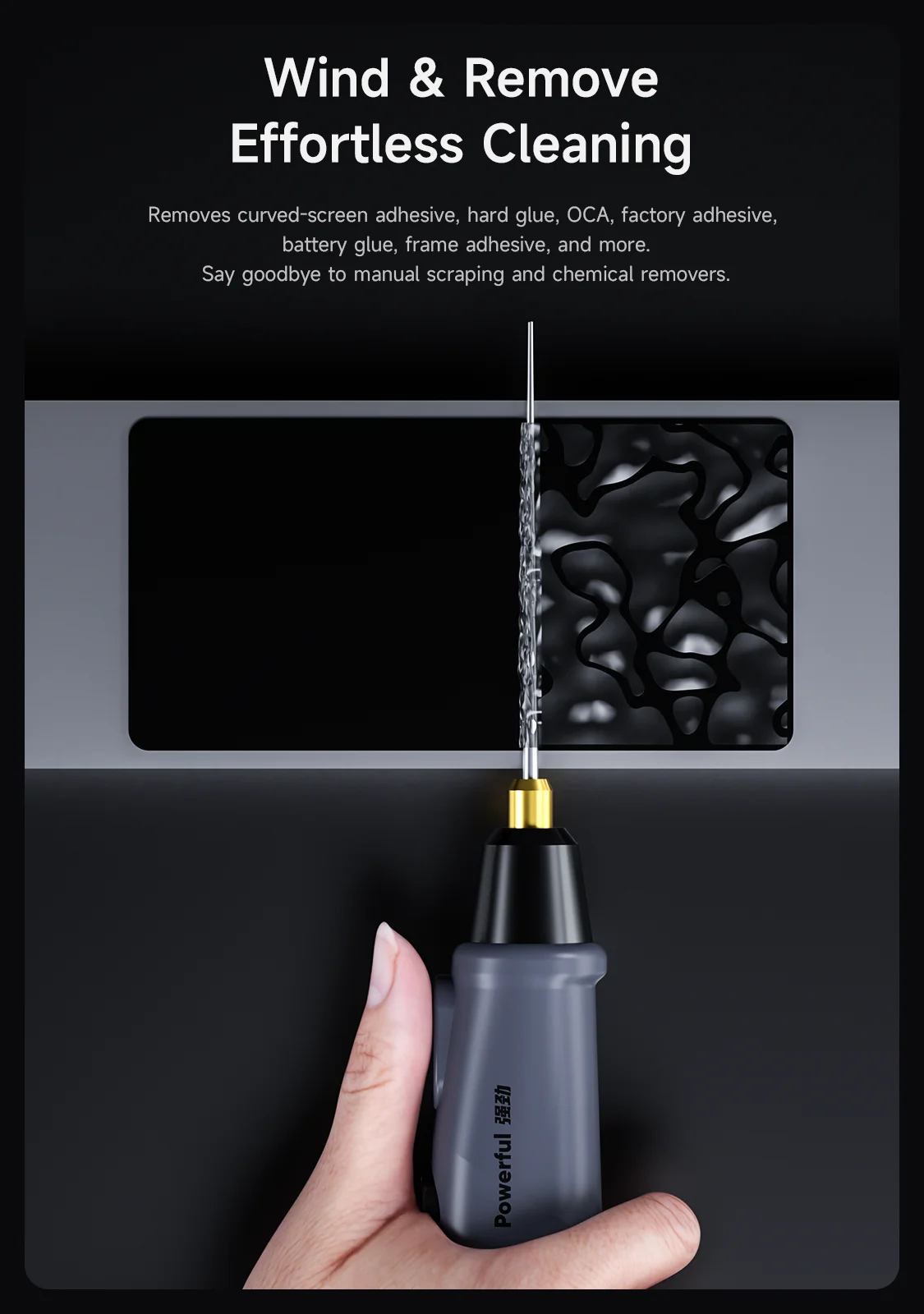 Maestría multipegamento: Elimina sin esfuerzo el adhesivo de pantalla curva, el pegamento duro, el adhesivo óptico OCA, los residuos de fábrica, el pegamento para baterías y el pegamento para marcos; diga adiós a los raspaduras manuales y a los productos químicos agresivos para siempre.💪