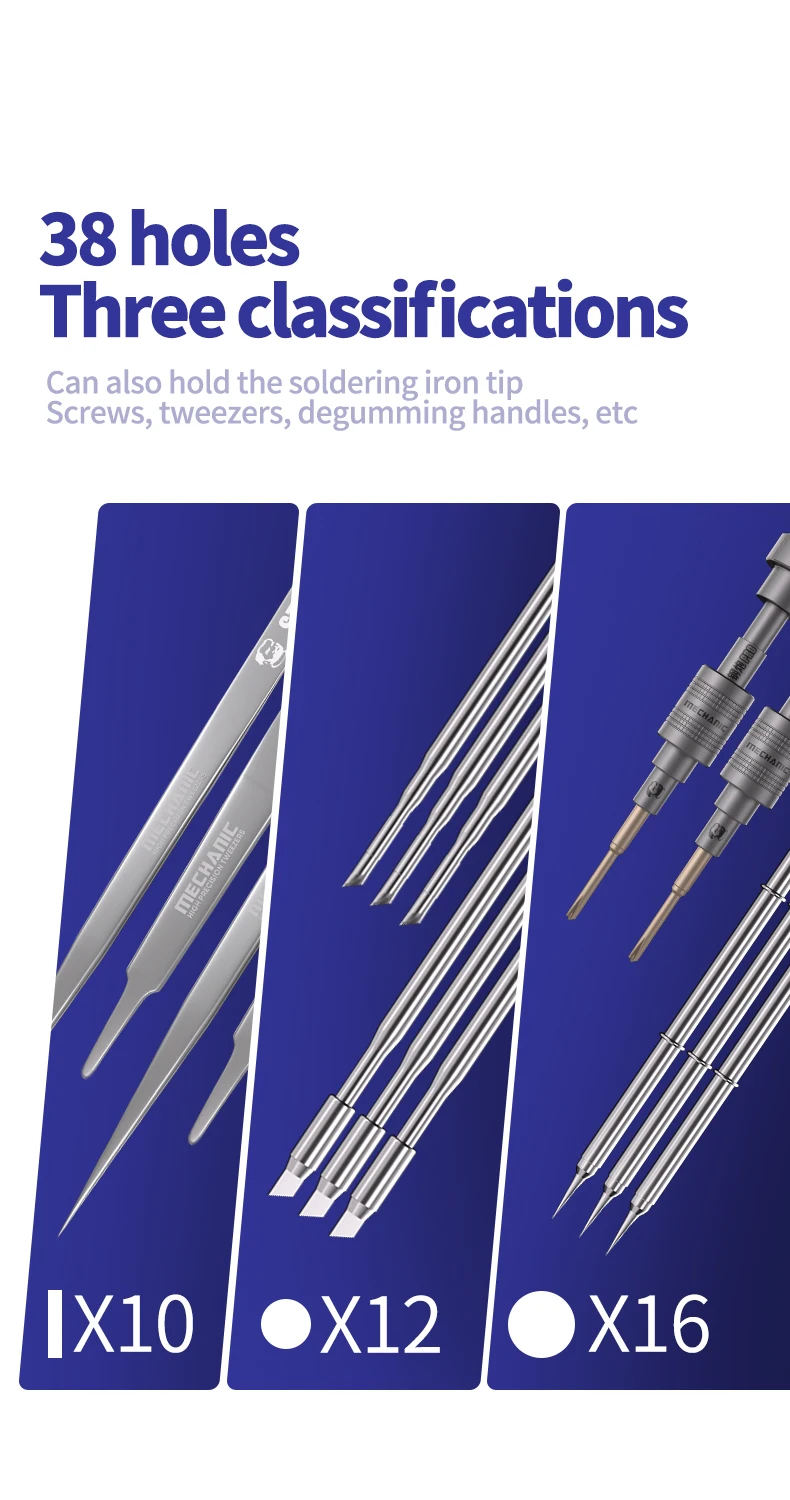 Excelente accesorio con monton de agujeros para pinzas, destornilladores, etc. Los agujeros exteriores son los mas grandes, si bien según que cosas no caben (e.j. cepillos, boligrafos).