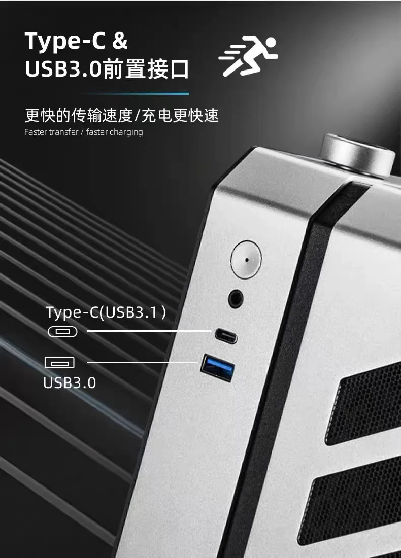 7. IO frontal: interruptor de encendido (LED incorporado), 1 * USB 3,0, Tipo-C 1 * (10G), auriculares 2 en 1 de audio
