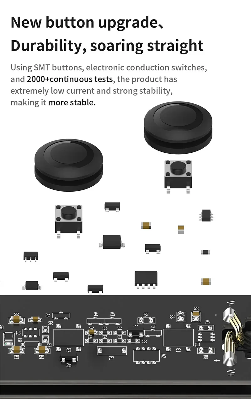 -Nueva Actualización de botón 、 Durabilidad, elevación recta, usando botones SMT, interruptores de conducción electrónicos y más de 2000 pruebas continuas, el producto tiene una corriente extremadamente baja y una fuerte estabilidad, lo que lo hace más estable.