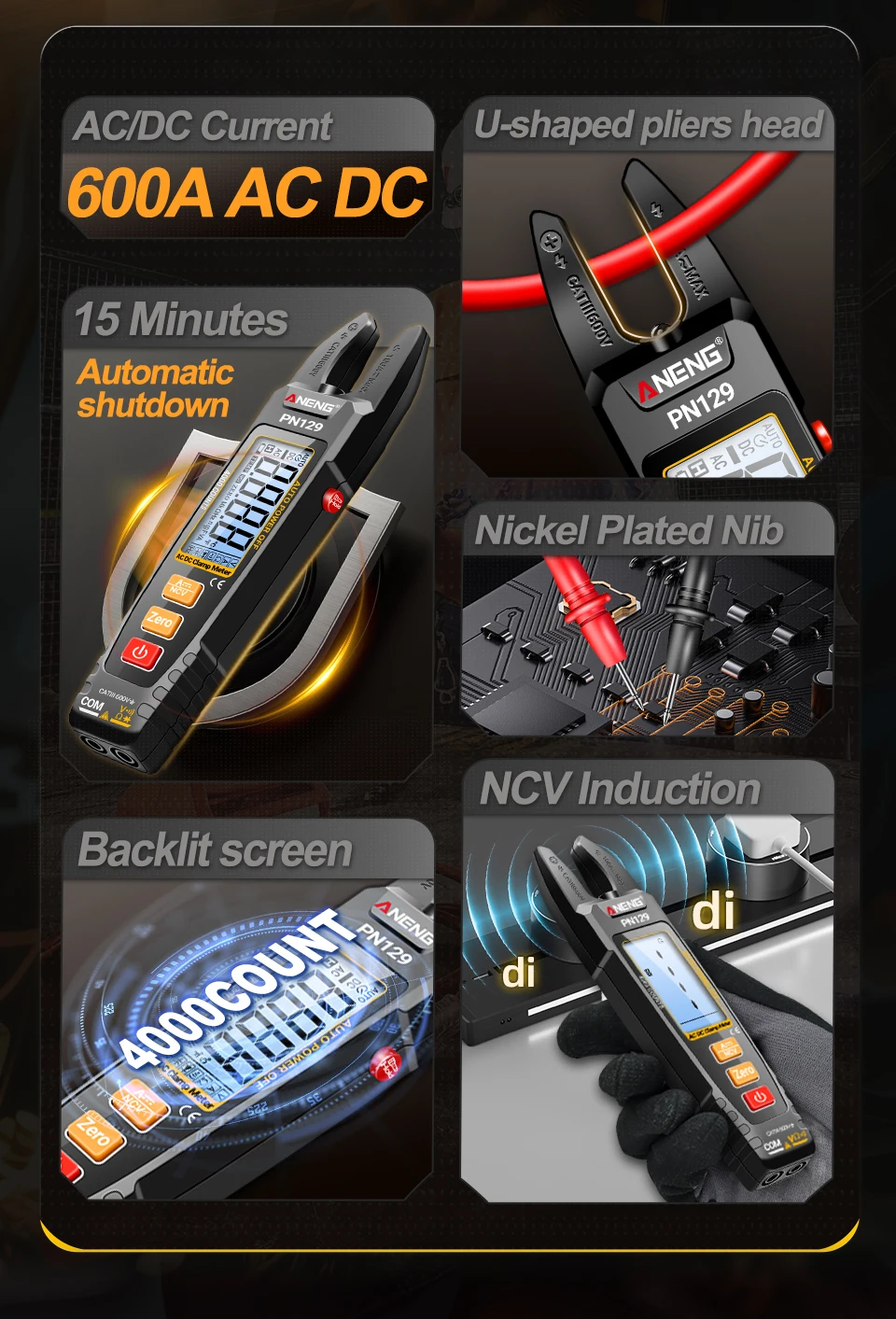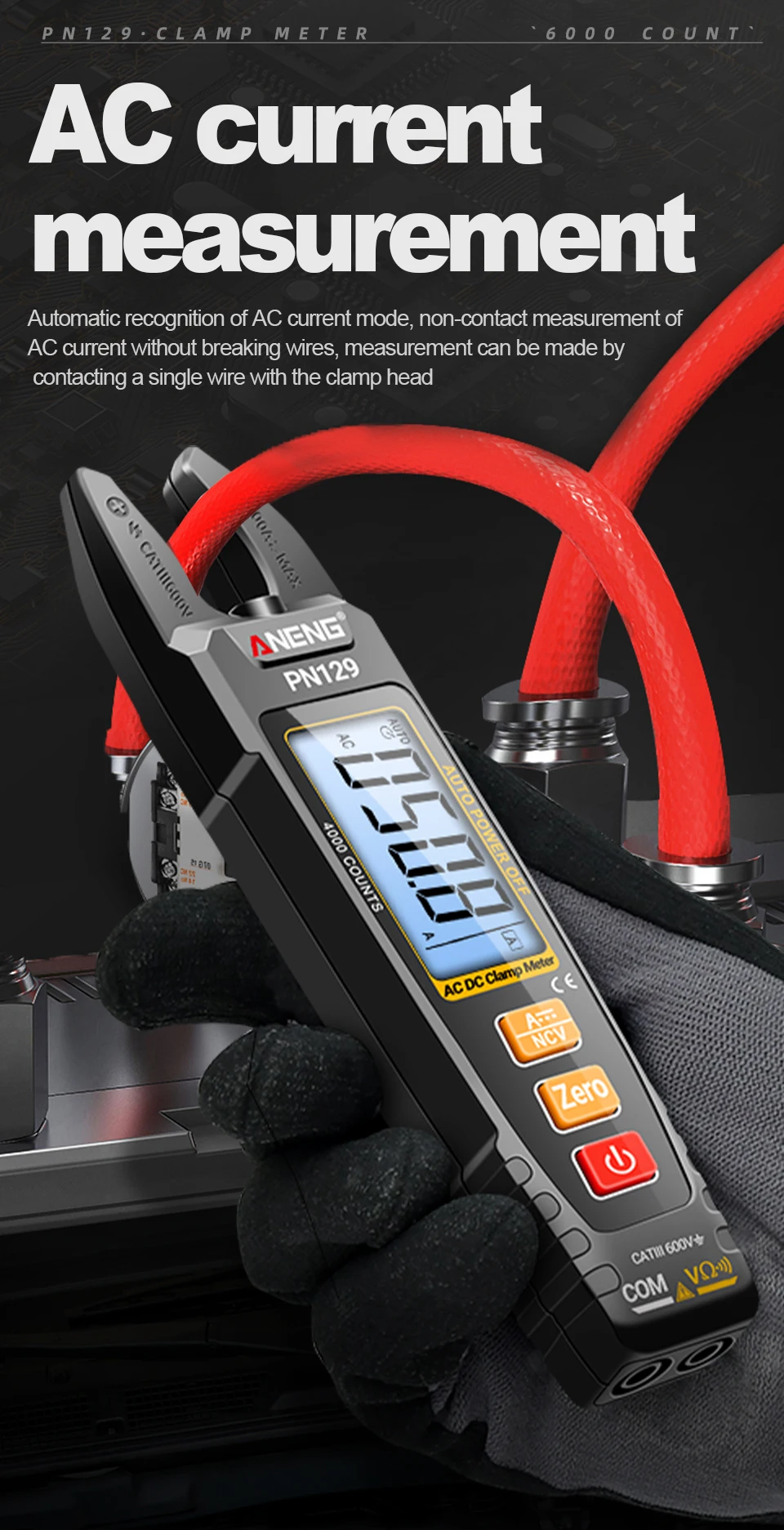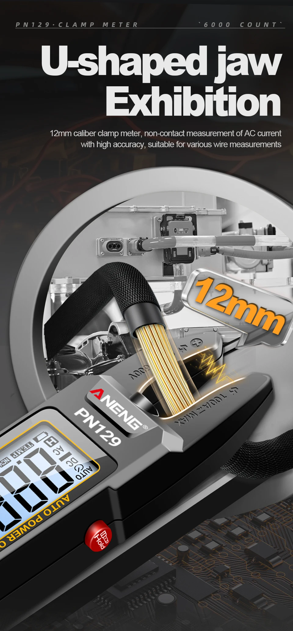 Medidor Digital de abrazadera en U ANENG PN129, amperímetro 100A AC/DC 600V NCV, multímetro de detección automática, 4000 cuentas, herramienta de electricista DIY