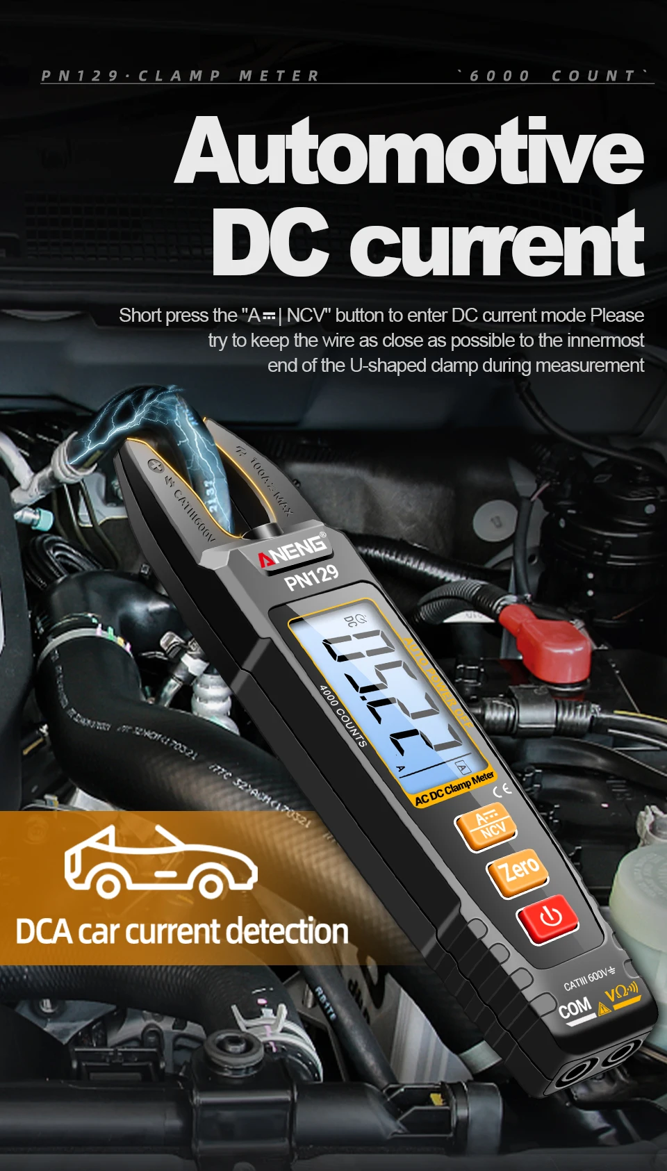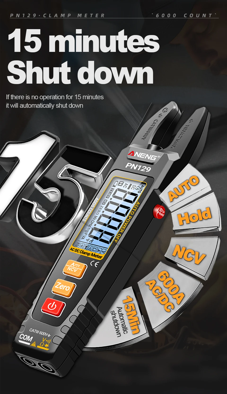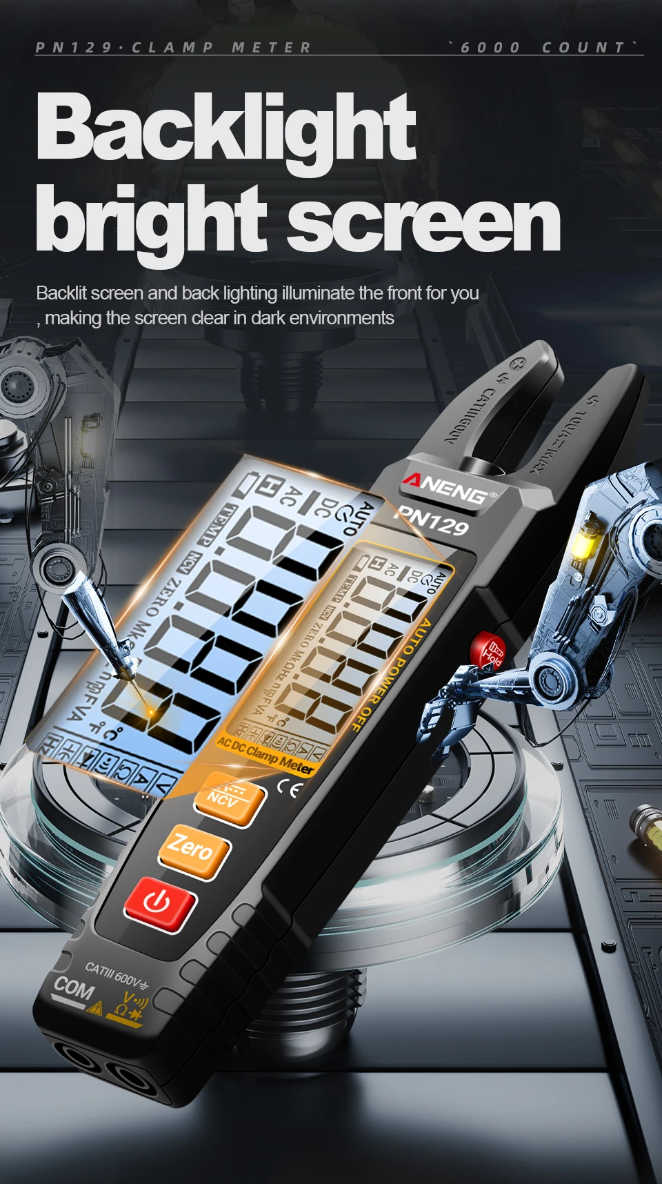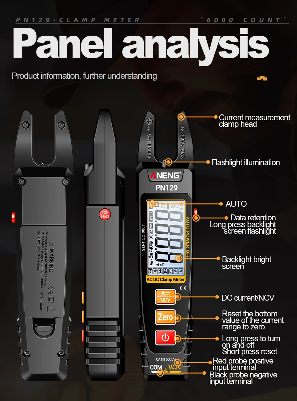 Medidor Digital de abrazadera en U ANENG PN129, amperímetro 100A AC/DC 600V NCV, multímetro de detección automática, 4000 cuentas, herramienta de electricista DIY