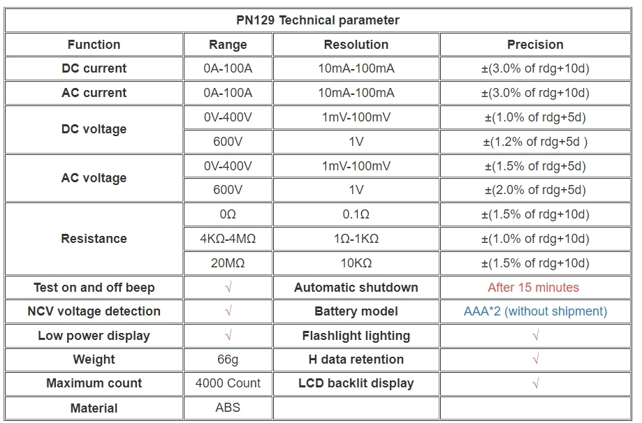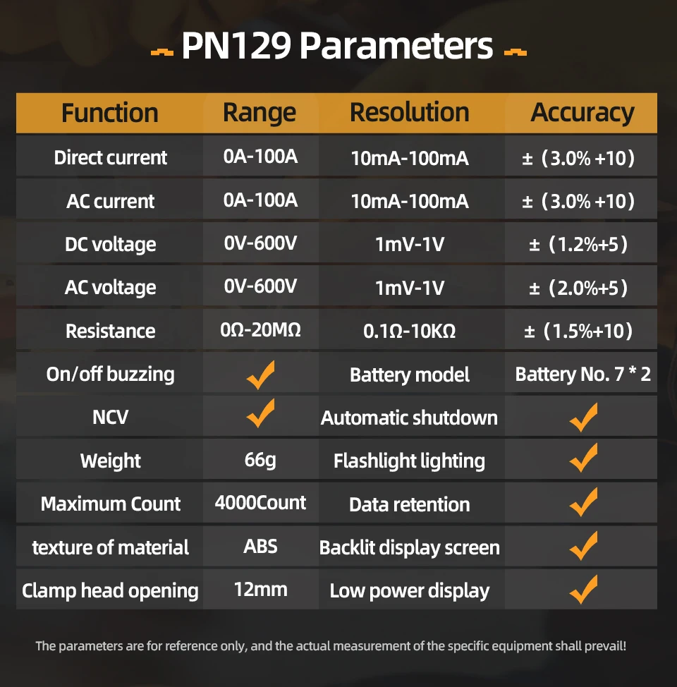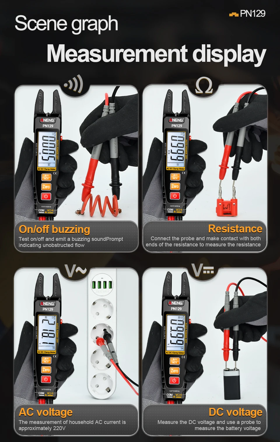 2.Modelo PN129 Pinza amperimétrica sin condensador, frecuencia Hz, función de diodo (AAA*2, sin envío)