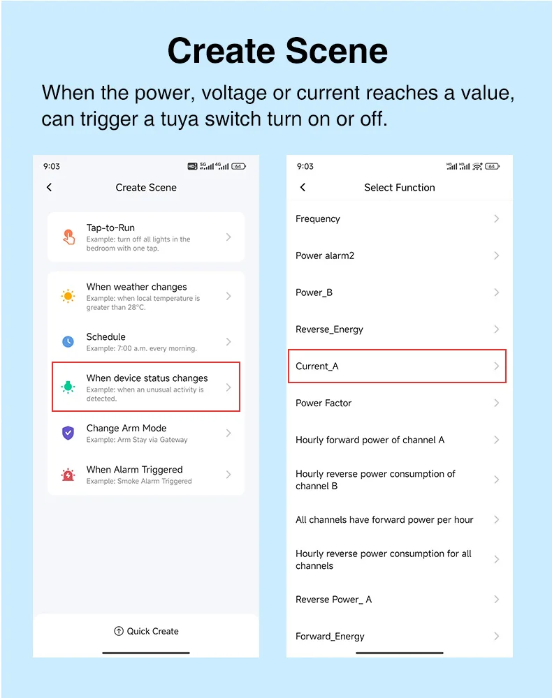 Función de automatización:Puede establecer el valor de potencia o corriente en la aplicación, solo cuando la potencia o la corriente excedan el valor, el dispositivo comenzará a funcionar.