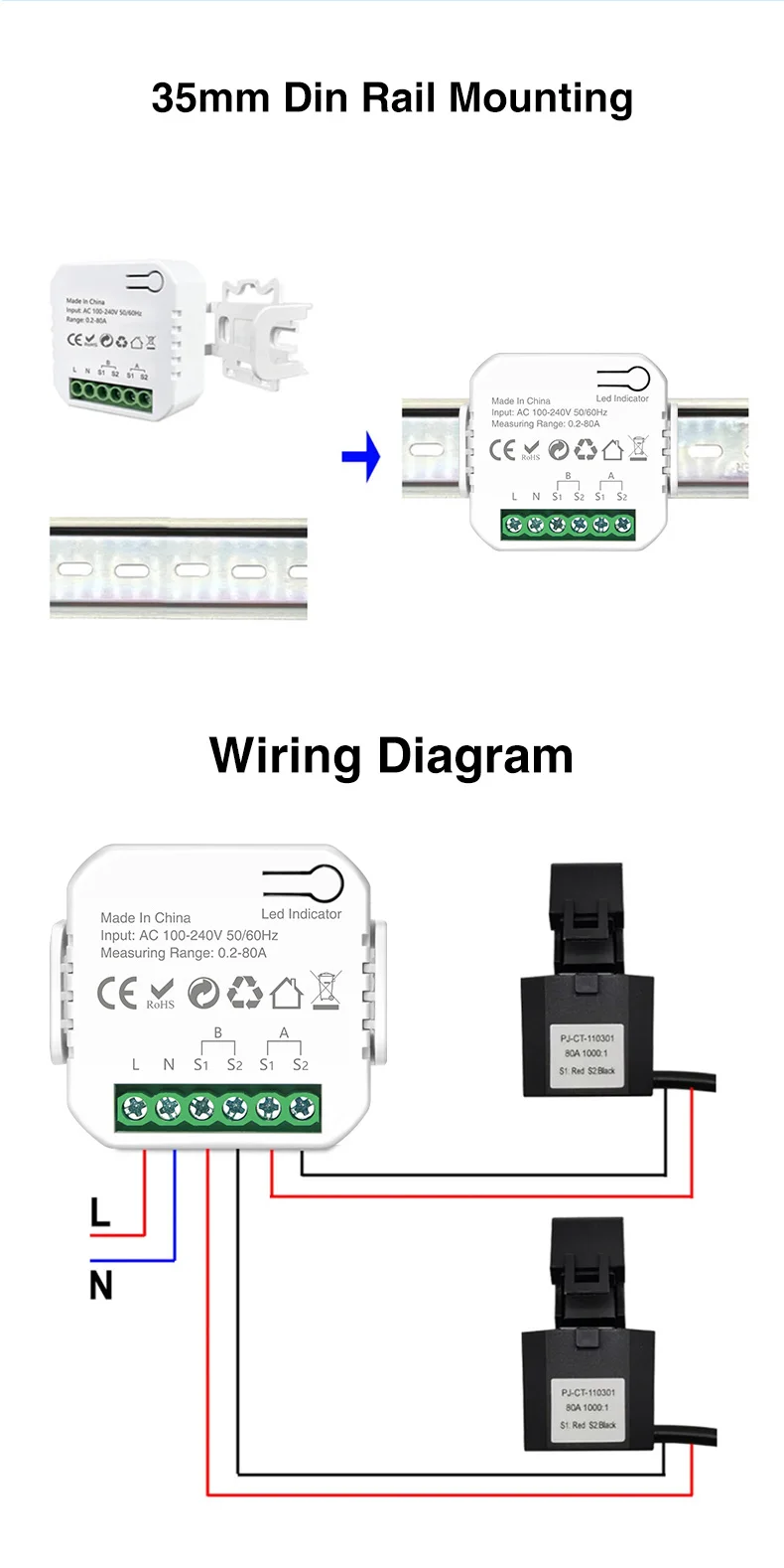 Fácil instalación:Montaje en riel de 35mm, sin necesidad de reemplazar la conexión de cables es más seguro, Solo coloque los cables en el clip y mida.