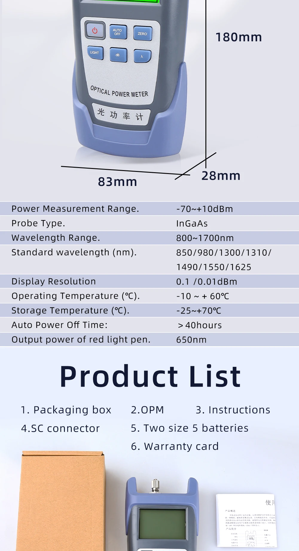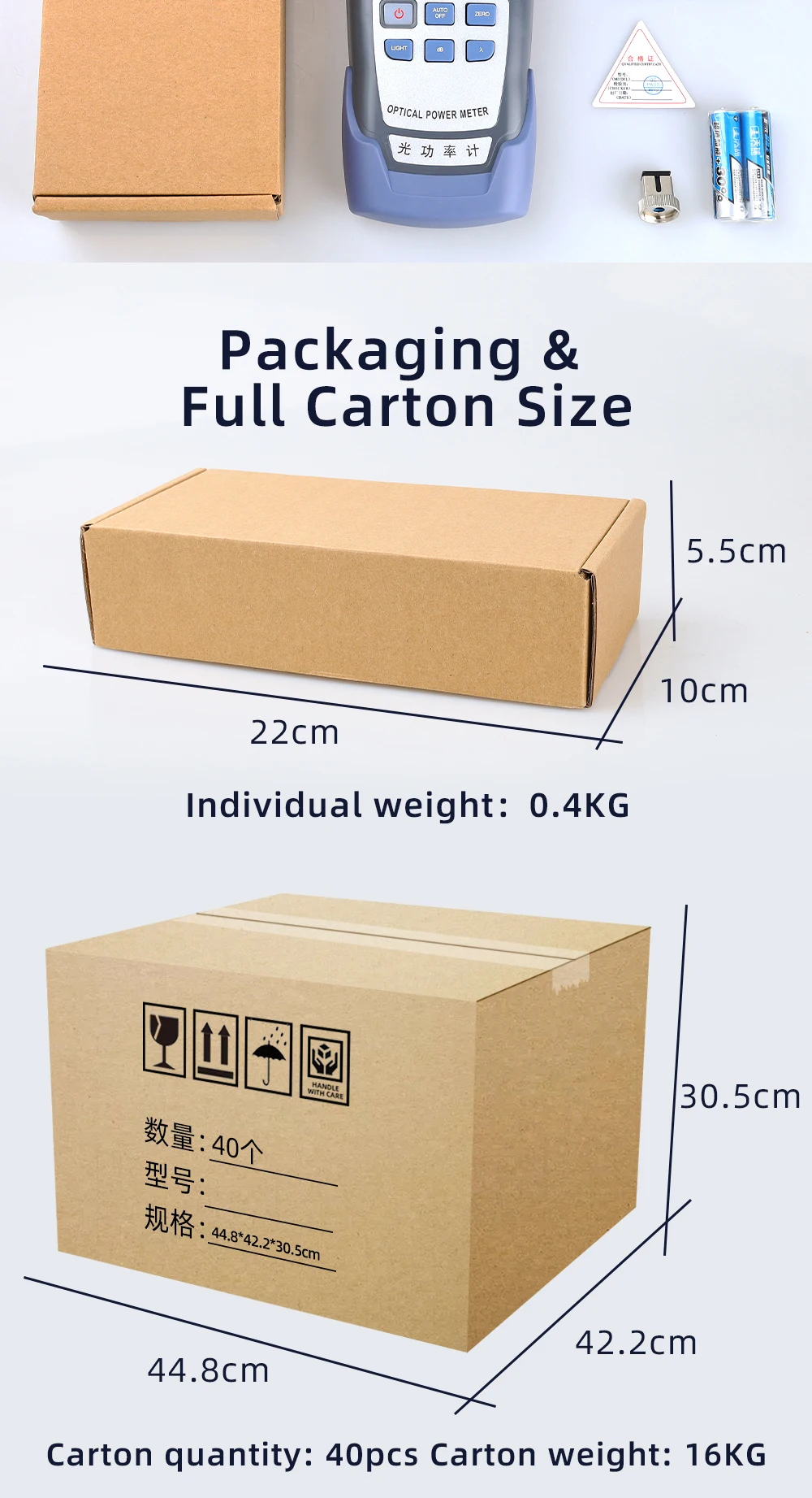 Nota: El medidor de potencia óptica ha sido actualizado y ya no requiere un adaptador, por lo que el medidor de potencia óptica SC y el adaptador LC no se envían en el paquete.