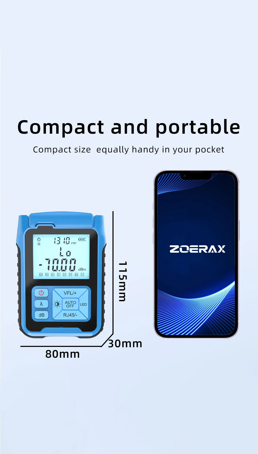 Este medidor de potencia óptica es un dispositivo multifuncional que integra función de prueba de red, fuente de luz roja y luz LED, diseñado para comunicación de fibra óptica y mantenimiento de red.