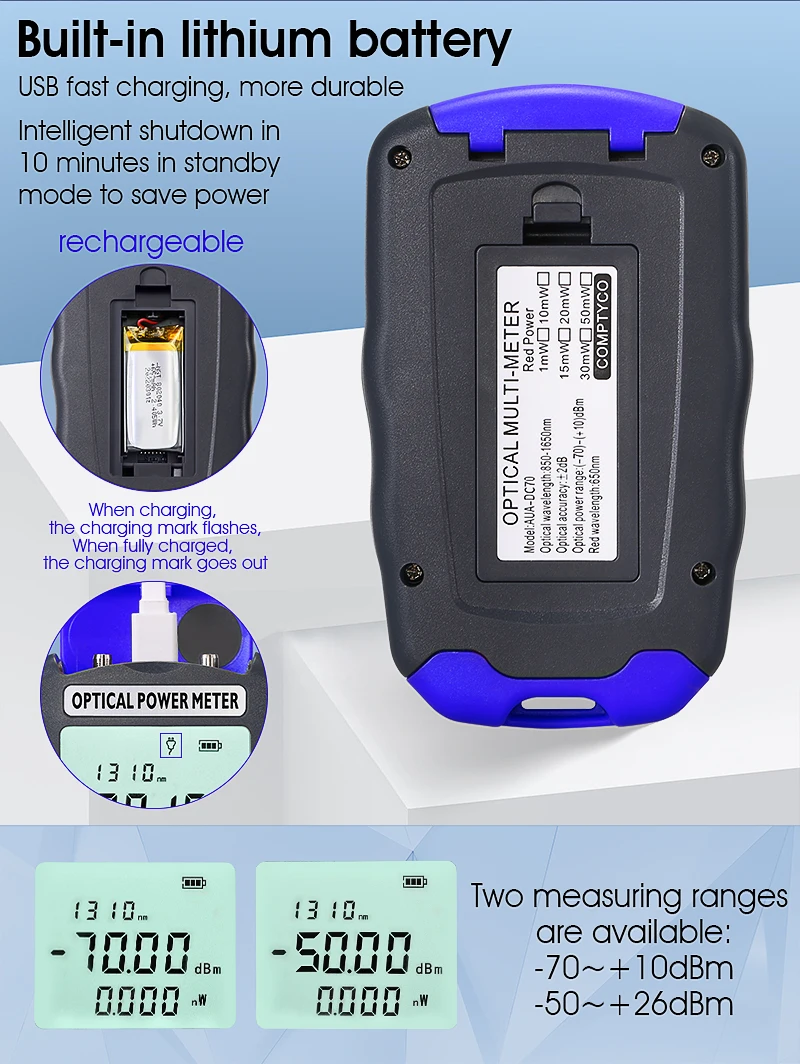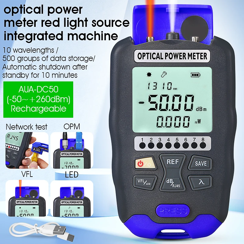 Comprar Medidor de potencia óptica AUA-DC50-50 ~ + 26dBm, probador de Cable de red de fibra multifunción 4 en 1, localizador Visual de fallas 1-50MW (opcional)