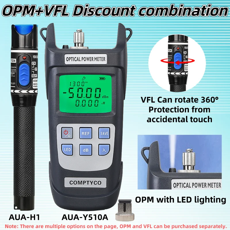 Comprar Medidor de potencia óptica AUA-Y510A, localizador Visual de fallos, Kit de herramientas de prueba de fibra FTTH (opcional) OPM(-50 ~ + 26dBm) y VFL(1/10/20/30/50mW)