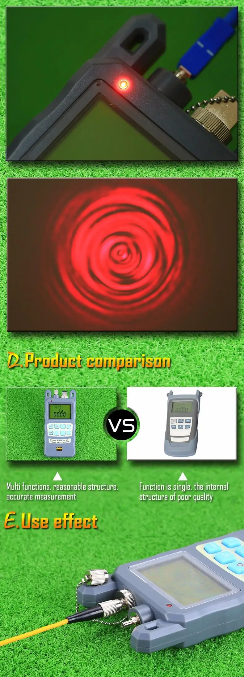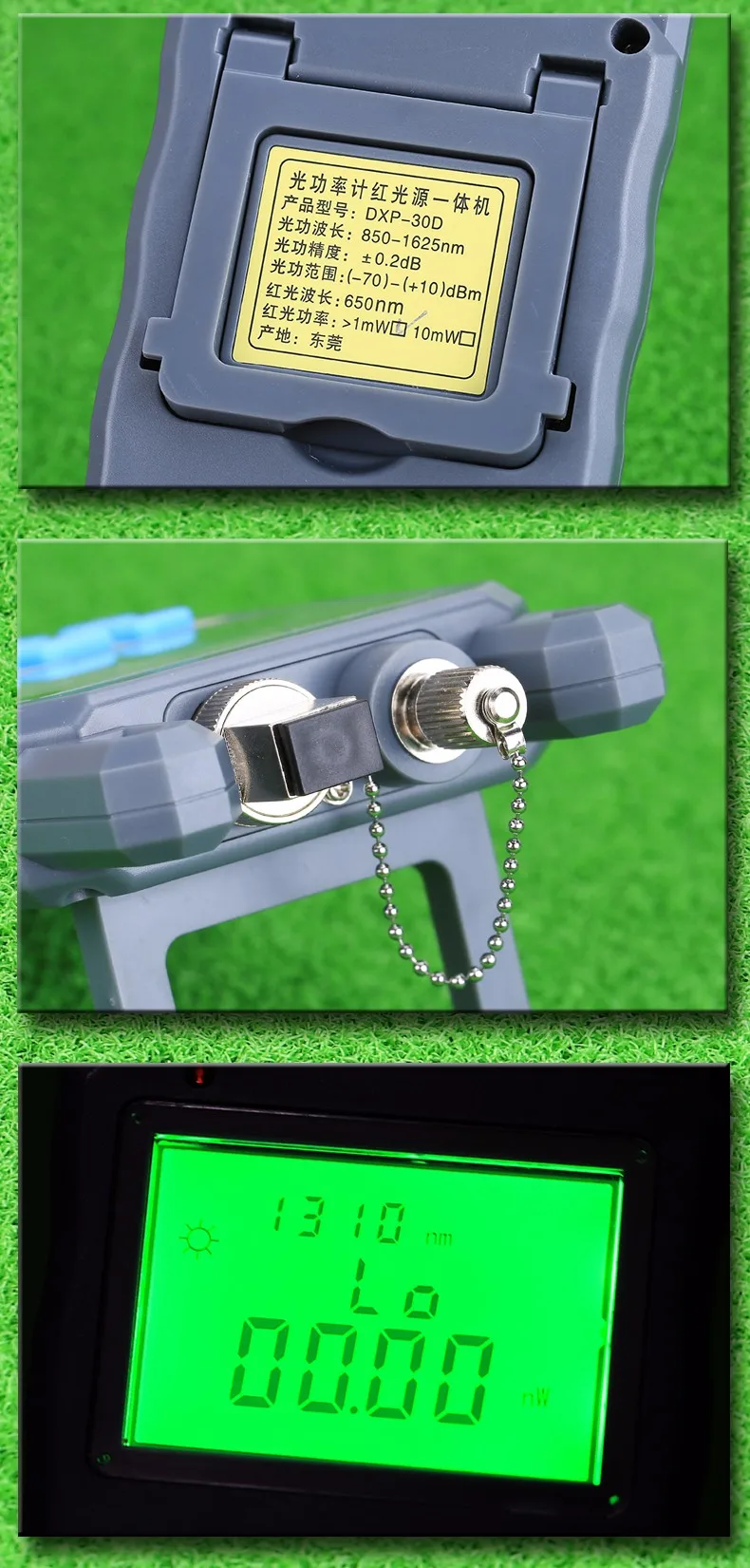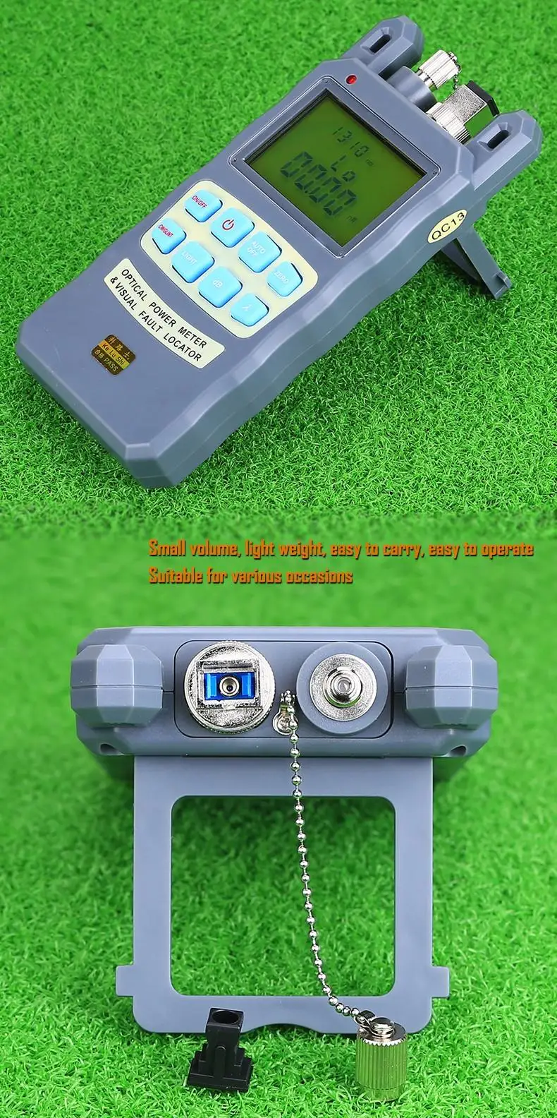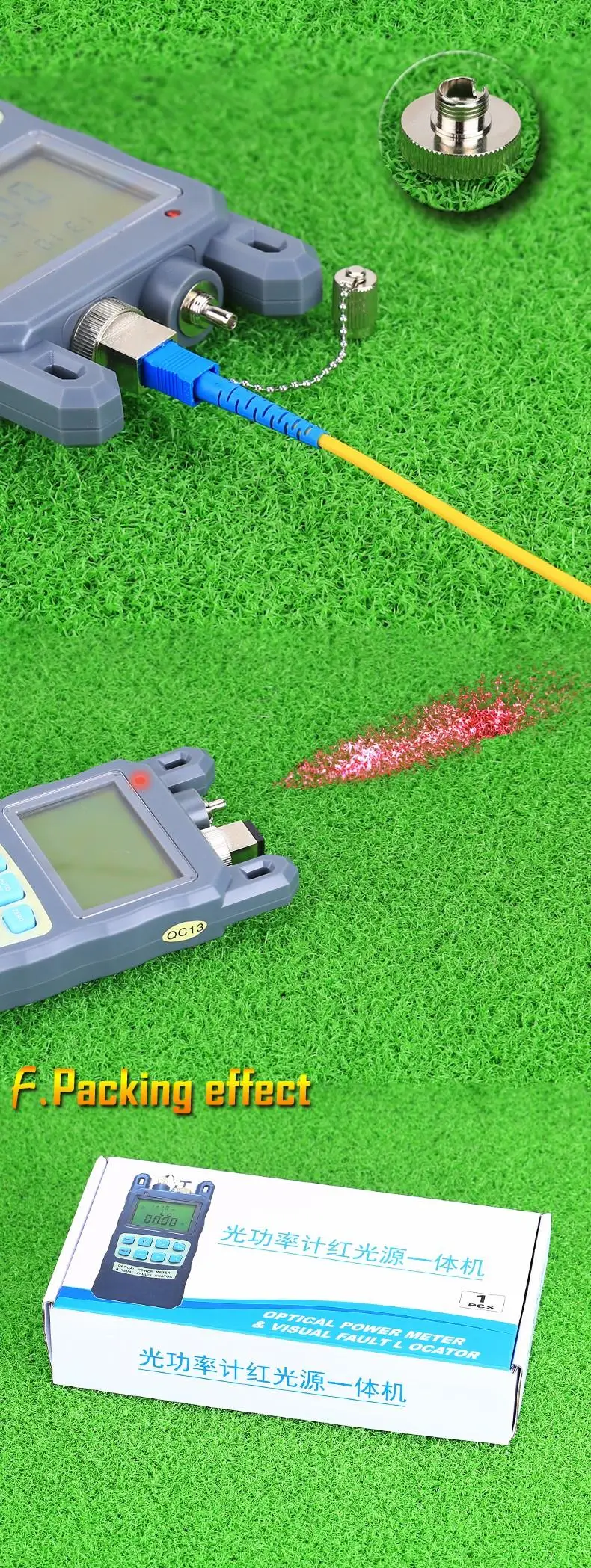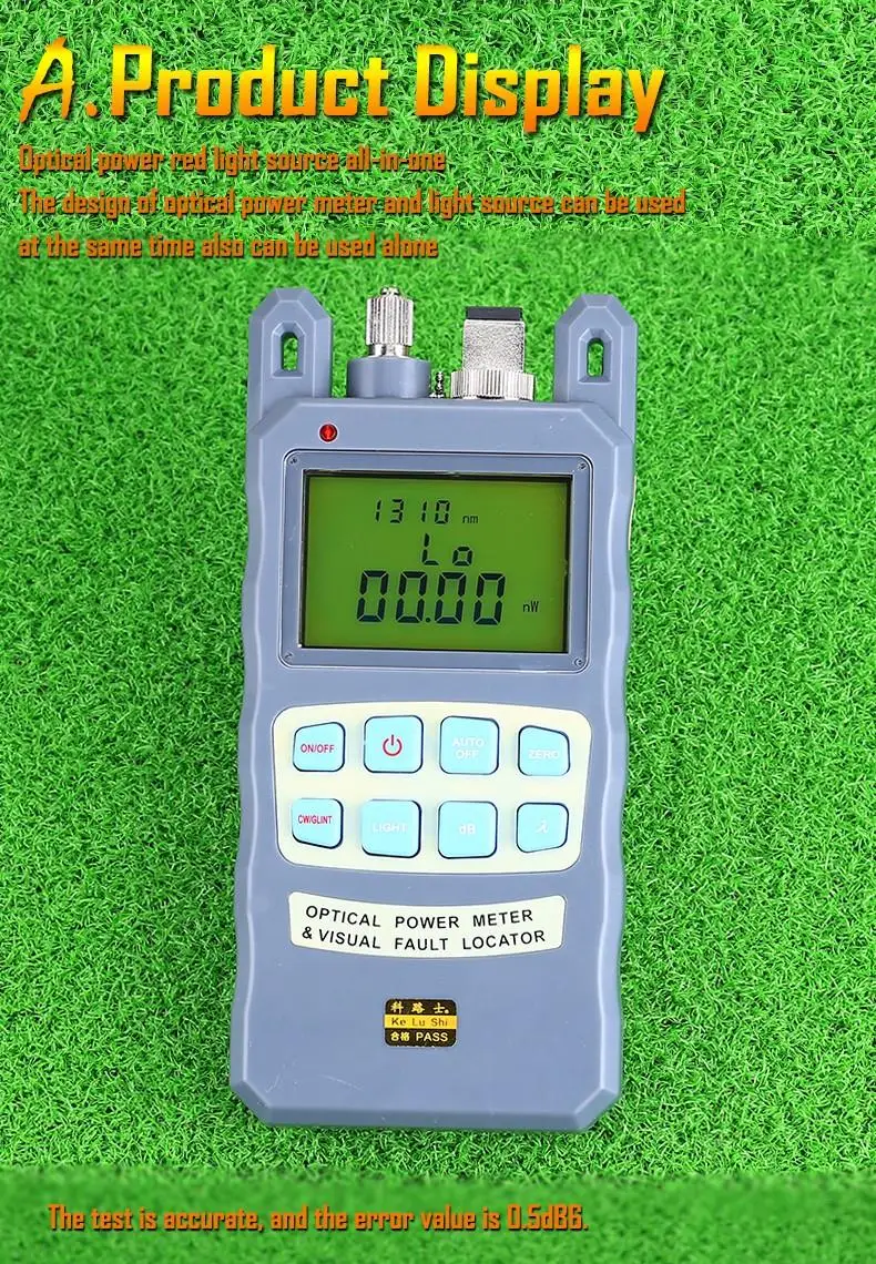 A) Medidor de potencia óptica con mango de fibra óptica-70 - + 10 dBmLongitud de onda de calibración (nm): 850 ~ 1625Tipo de detector: InGaAsRango de medición (dBm): -70,+ 10dBmIncertidumbre (dB): + 0,2 (5%)Linealidad (dB): 0,01Resolución de pantalla (dB): 0,03Frecuencia ID Hz: 270 330 1K 2KIdentificación de onda nm: 850, 980, 1300, 1310, 1490, 1550Capacidad de almacenamiento de Fecha: 1000Conector: FC/SC/intercambiableTiempo de funcionamiento de la batería (h): 240 sin retroiluminaciónTemperatura de funcionamiento (oC): -10(oC) + 60Temperatura de almacenamiento (oC): -25(oC)+ 70Dimensión (MM): 180*83*28Peso (g): 260B)10MW Luz láser roja Probador de cable de fibra óptica Localizador visual de fallas1. Longitud de onda central: 650nm2. Tipo de emisor: LD3. Potencia de salida: 1 mW4. Conector óptico: conector universal de 2,5mm5. Frecuencia CW: 2Hz6. Fuente de alimentación: 2 pilas alcalinas AA7. Temperatura de funcionamiento: -10 ~ + 608. Temperatura de almacenamiento: -20 ~ + 70
