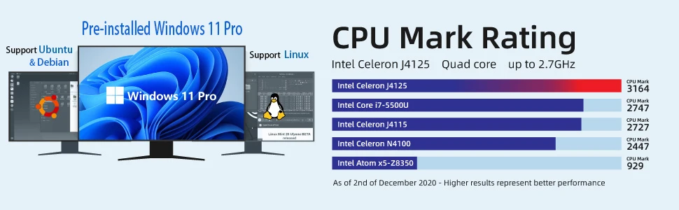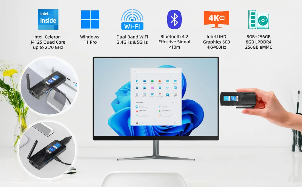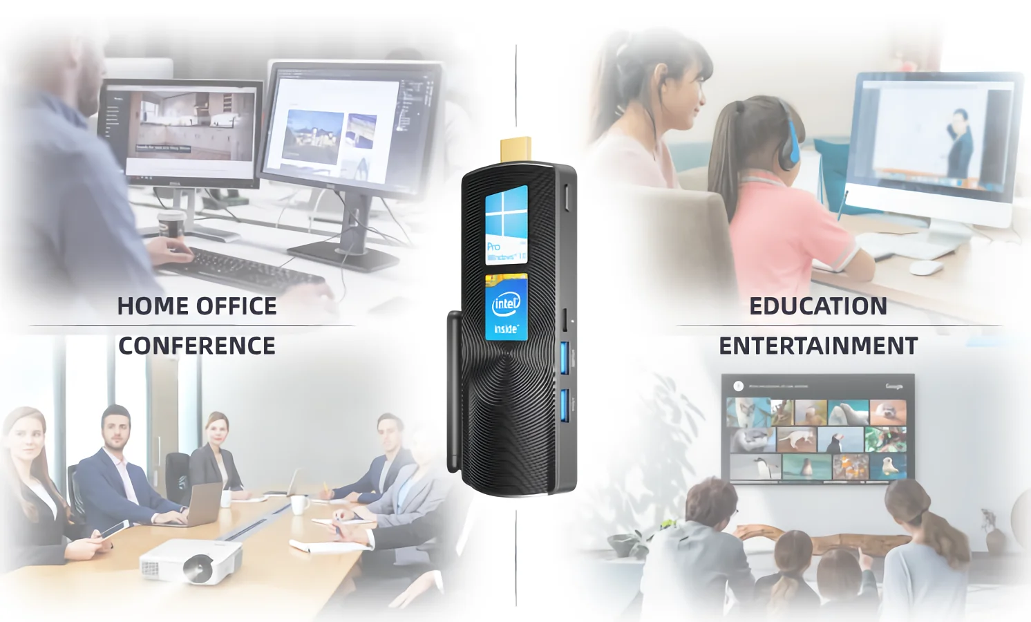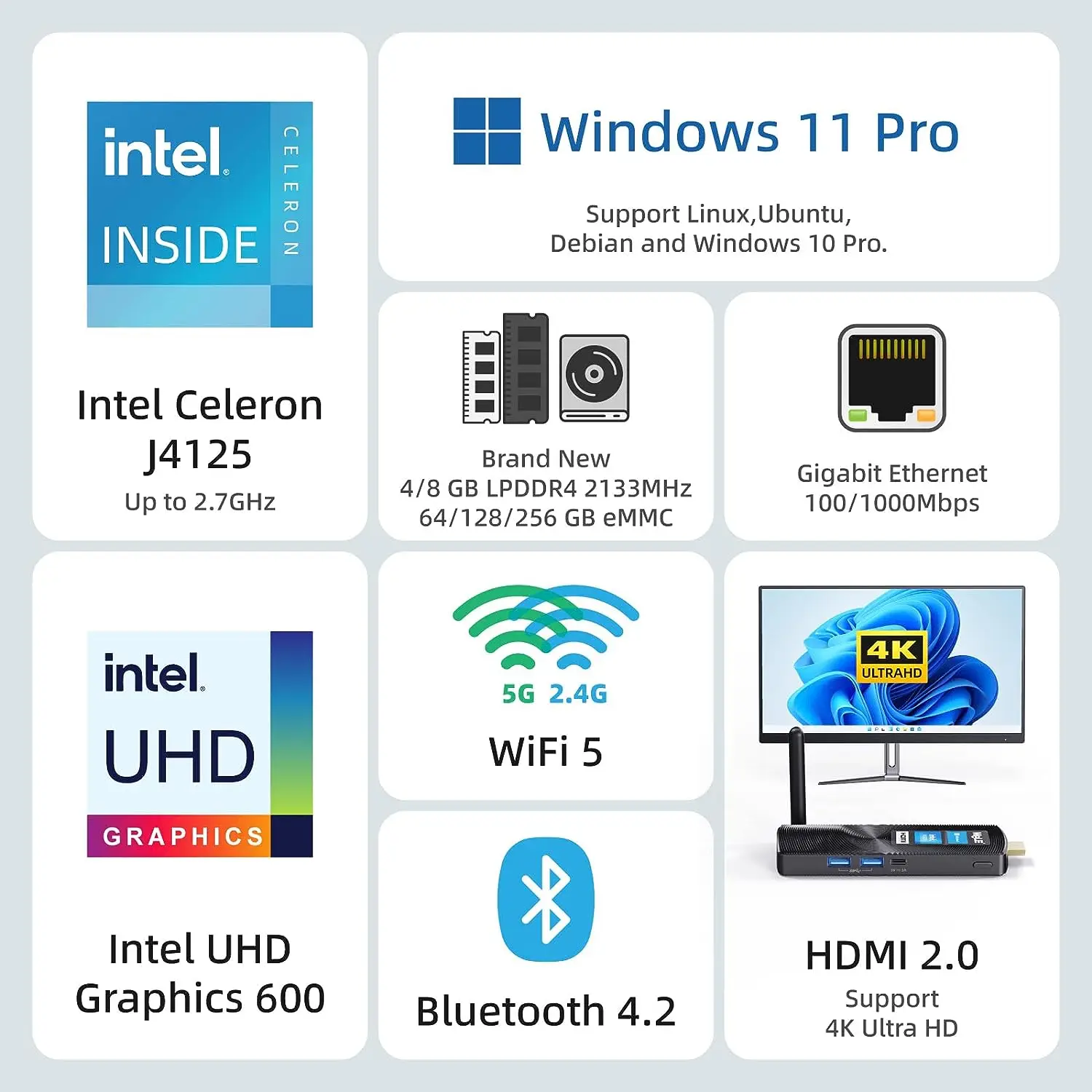 Procesador Intel Celeron de cuatro núcleos, memoria de hasta 8GB, almacenamiento integrado de hasta 256GB, soporte de salida de vídeo de hasta 4K a 60Hz, resolución máxima 4096x2160, es ampliamente utilizado para entretenimiento en el hogar, oficina, educación, Centro de Capacitación, señalización digital, proyecto IOT, etc.