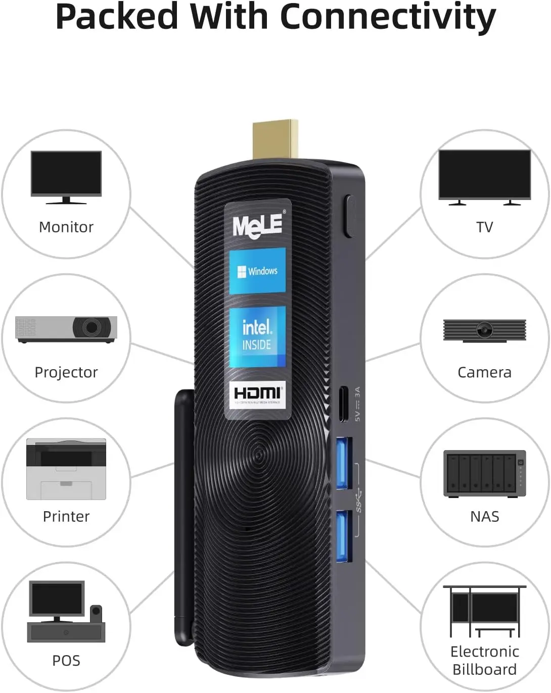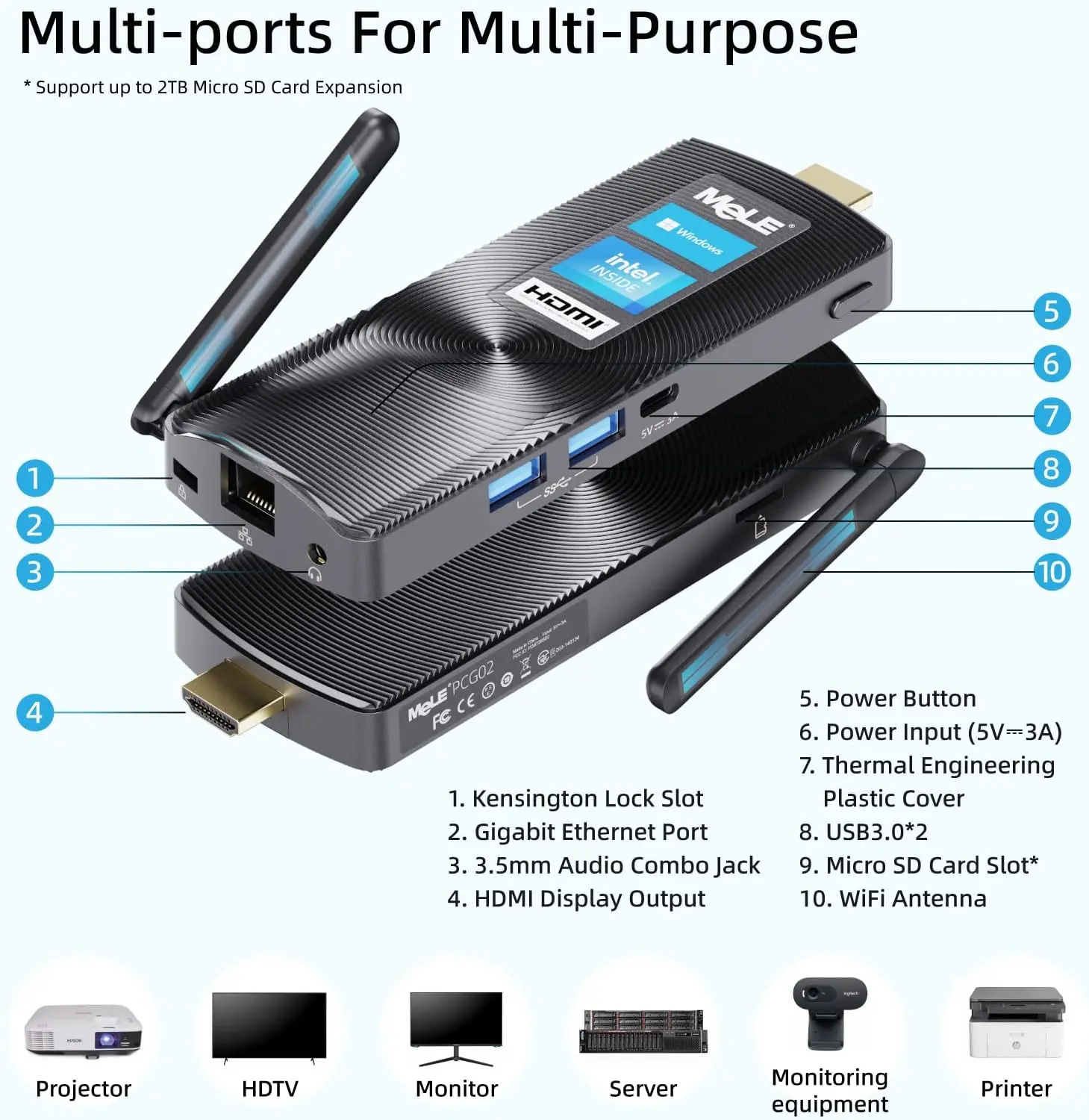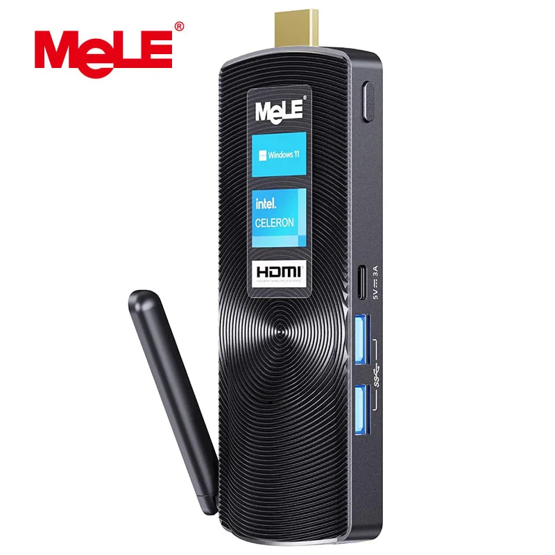 MeLE Fanless Mini PC Stick es de bolsillo, sin sistema preinstalado, los clientes pueden instalar su propio sistema. Puede transformar cualquier televisor en una llamativa Pantalla de señalización digital y abrir un mundo de posibilidades informáticas a su hogar, oficina o cualquier otro lugar que lo necesite.