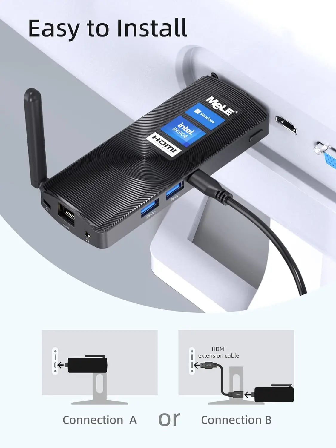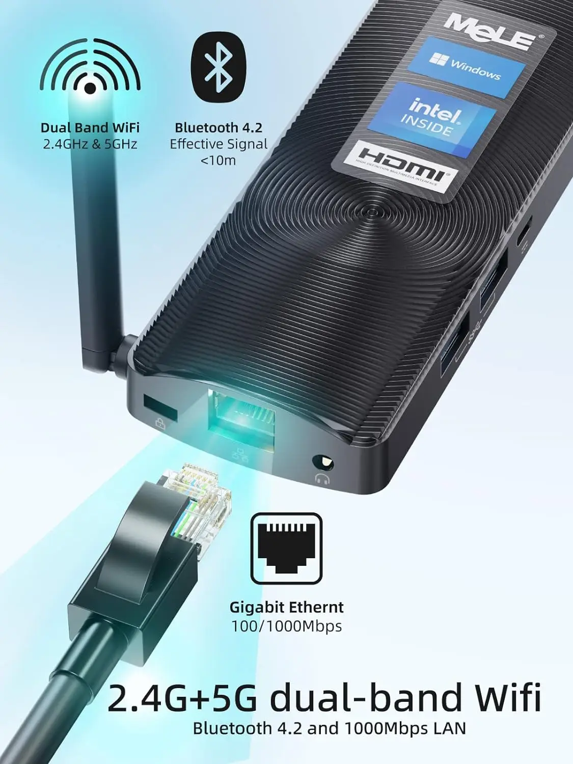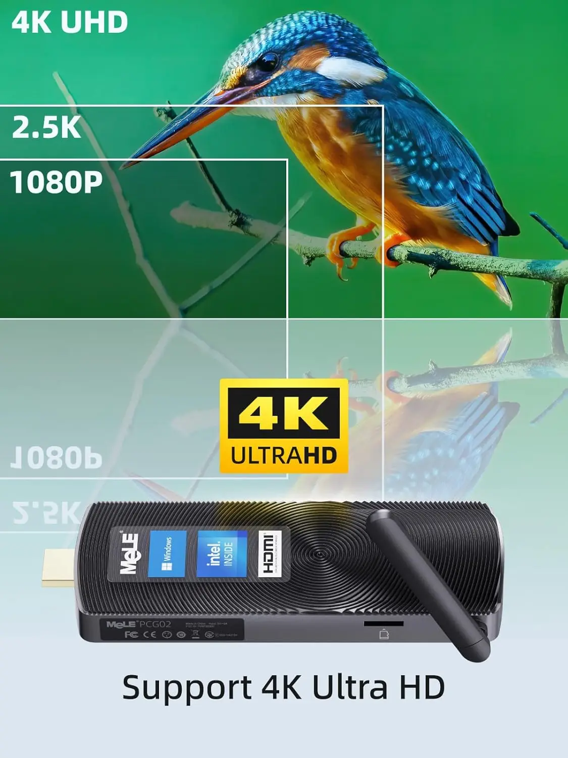 MeLE Fanless Mini PC Stick es de bolsillo, sin sistema preinstalado, los clientes pueden instalar su propio sistema. Puede transformar cualquier televisor en una llamativa Pantalla de señalización digital y abrir un mundo de posibilidades informáticas a su hogar, oficina o cualquier otro lugar que lo necesite.