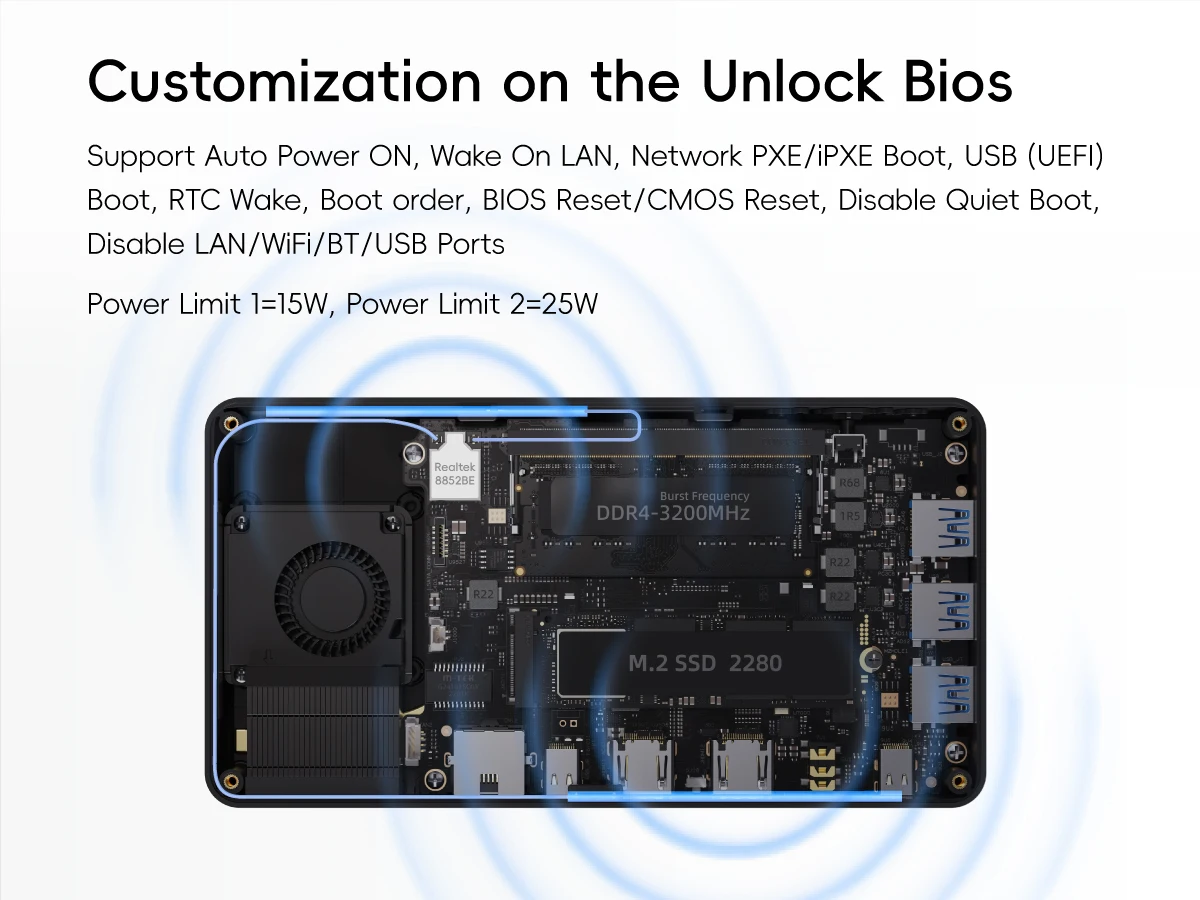 Admite encendido automático, encendido de LAN, arranque de red PXE/iPXE, arranque USB (UEFI), activación RTC, orden de arranque, reinicio BlOS/reinicio CMOS, desactivación de arranque silencioso, desactivación de puertos LAN/WiFi/BT/USB