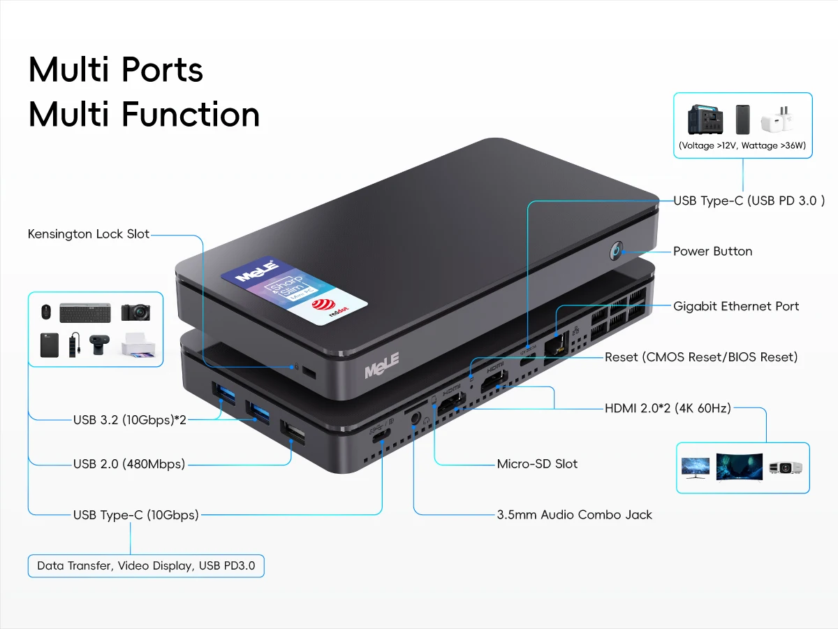 MeLE Overclock 4C proporciona PCIE3.0*4 para la interfaz M.2 y la velocidad límite superior puede alcanzar los 3940 MB/s.4 veces mayor que la de otras Mini PC.Al mismo tiempo, la PC delgada proporciona interfaces ricas, incluidas USB2.0*1, USB3.0 Gen2*2, USB-C 3.2 Gen2*1, ranura Micro-SD USB2.0*1, HDMI 2.0*2 y 1* puerto Ethernet Gigabit RJ45.
