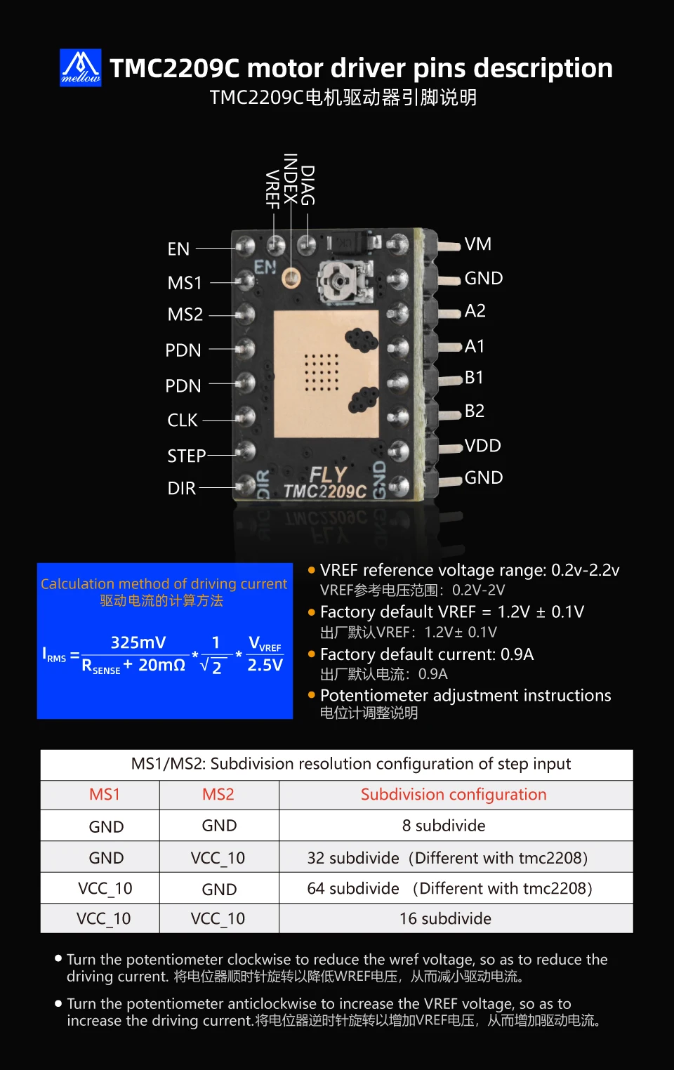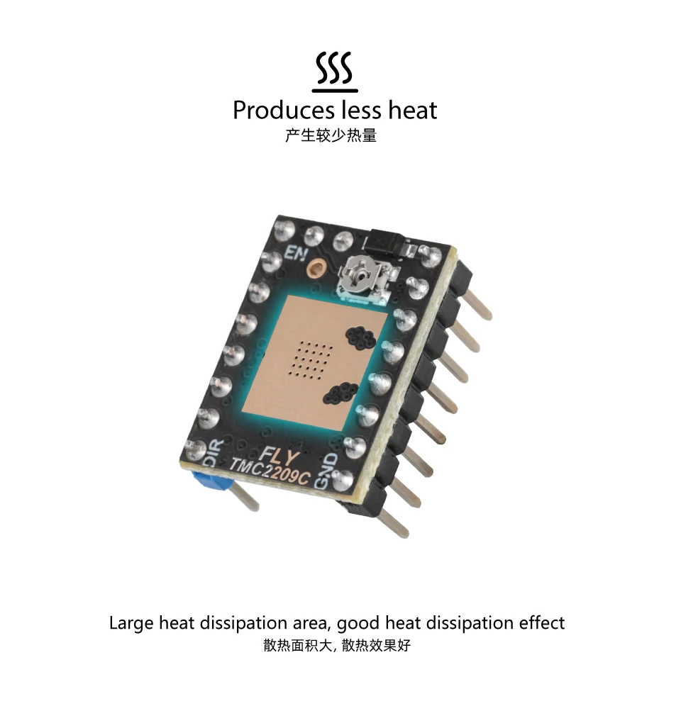 Control actual:El TMC2209 presenta un ajuste dinámico de corriente, lo que permite al controlador adaptar su corriente según los requisitos de carga reales.Esto ayuda a reducir el consumo de energía y minimiza el calentamiento del motor durante condiciones de luz o sin carga.