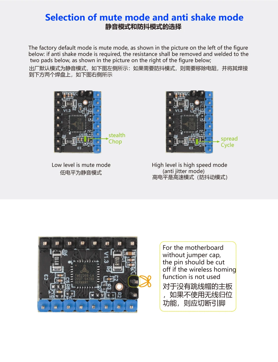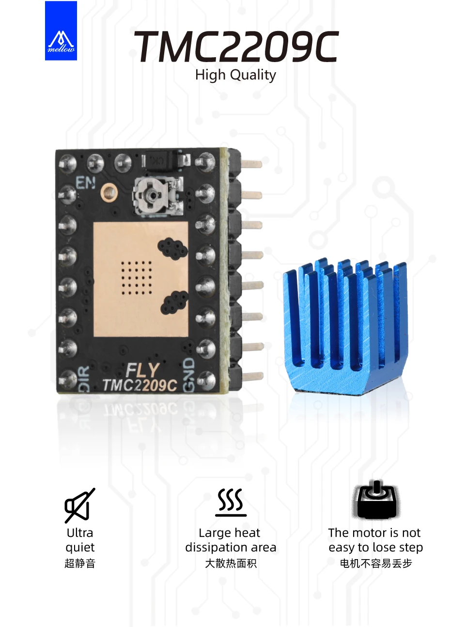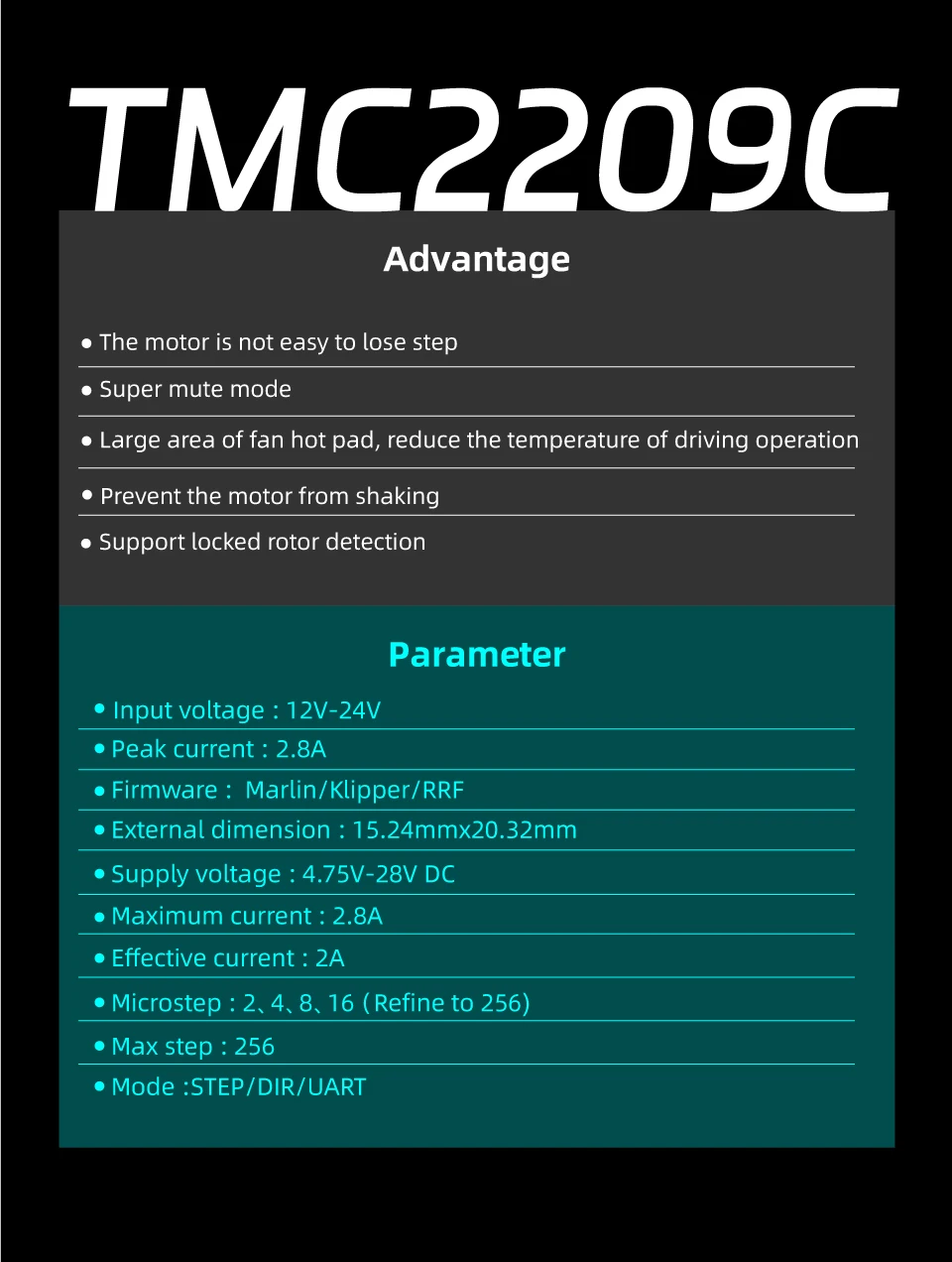 Operación silenciosa:El TMC2209 incorpora la tecnología StallGuard de Trinamic, lo que permite una detección imperceptible de stallo en la mayoría de las condiciones operativas.Esto ayuda a garantizar un funcionamiento suave y reduce el ruido tanto en el motor como en el sistema mecánico.