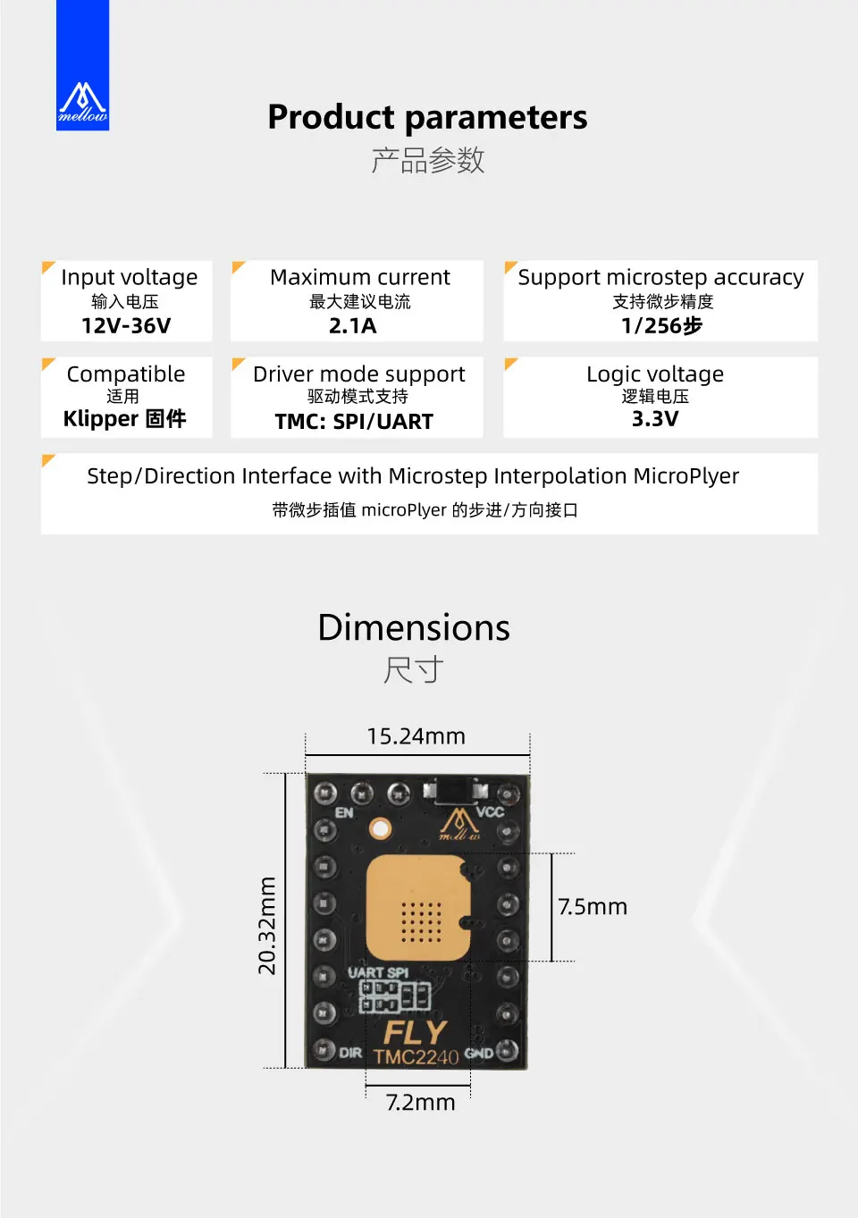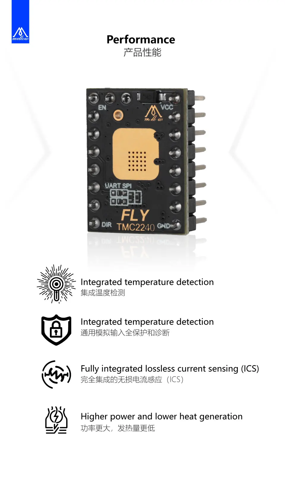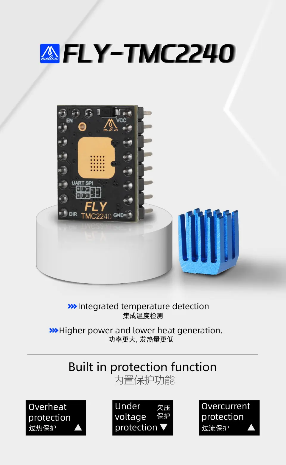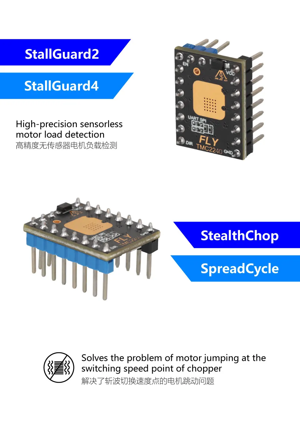 Current control method: TMC2240 uses a more advanced hybrid current control method, which means it can achieve higher step resolution at higher step angles. TMC2209 uses a traditional directional current control method.