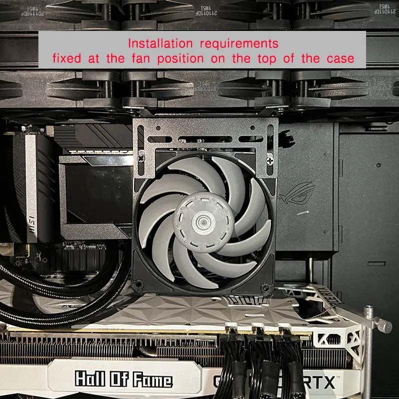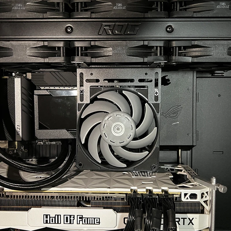 compatible con ventiladores de 120mm y 140mm, y incluye algunos tornillos. Se utilizará para enfriar los módulos de RAM para overclockear.