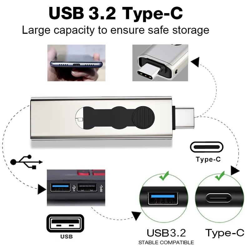 • Interfaz USB 3.2:Con una interfaz USB 3.2, esta unidad flash ofrece velocidades de transferencia de datos rápidas, lo que la hace ideal para transferir archivos grandes rápidamente.